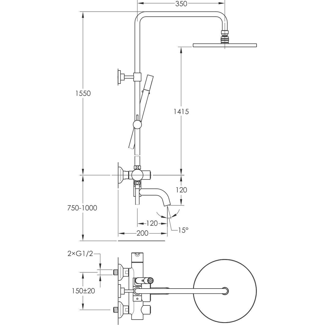 - висота штанги 1550 мм не регульована, кронштейн 350 мм поворотний