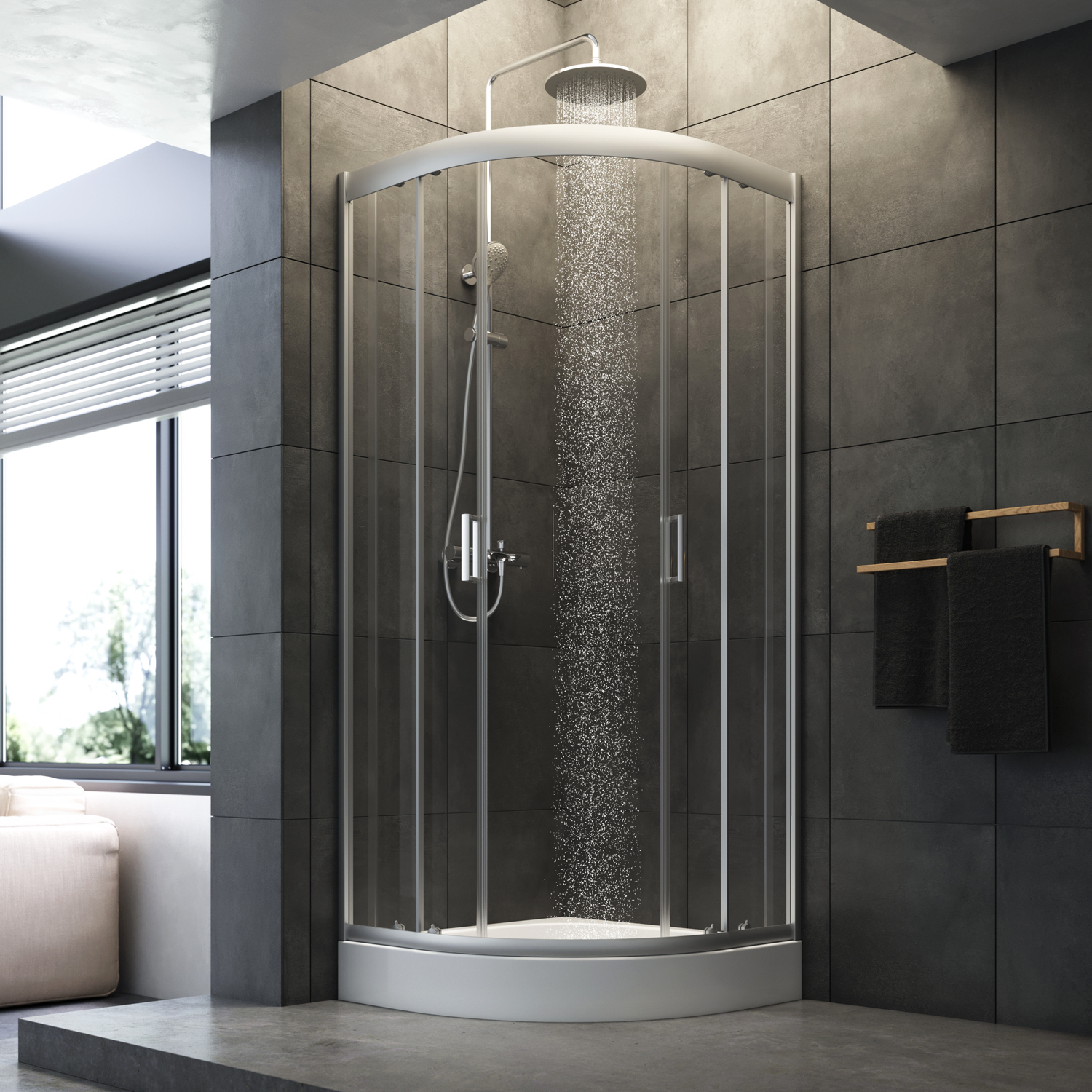 Система кріплення профілів QuickFix - простий та швидкий монтаж душового огородження. Надійні хромовані подвійні ролики – щонайменше 150 000 відкривань. Прозоре загартоване скло завтовшки 5 мм. Ручка із алюмінію. Висота огорожі без піддону 1900 мм.