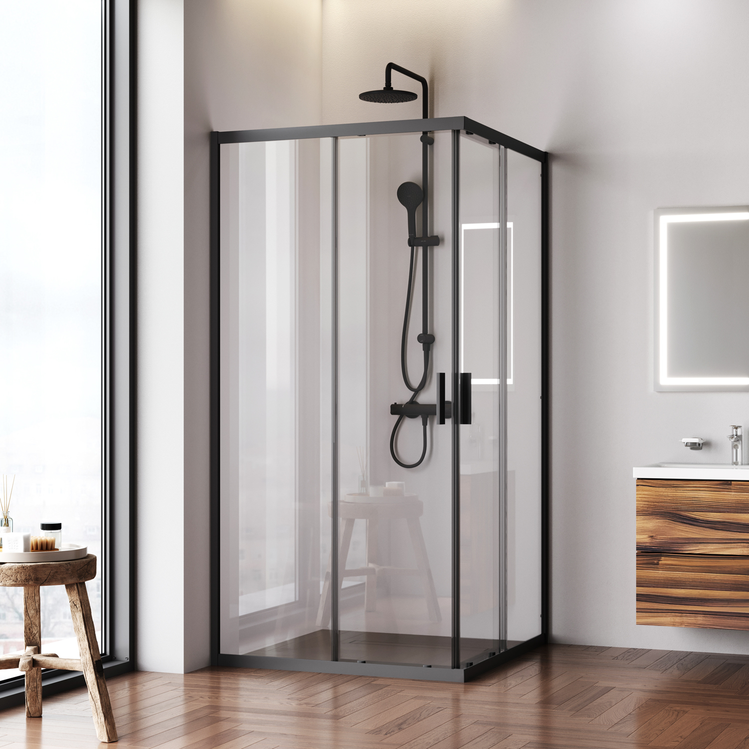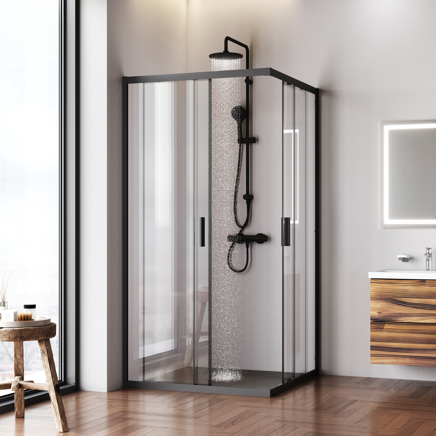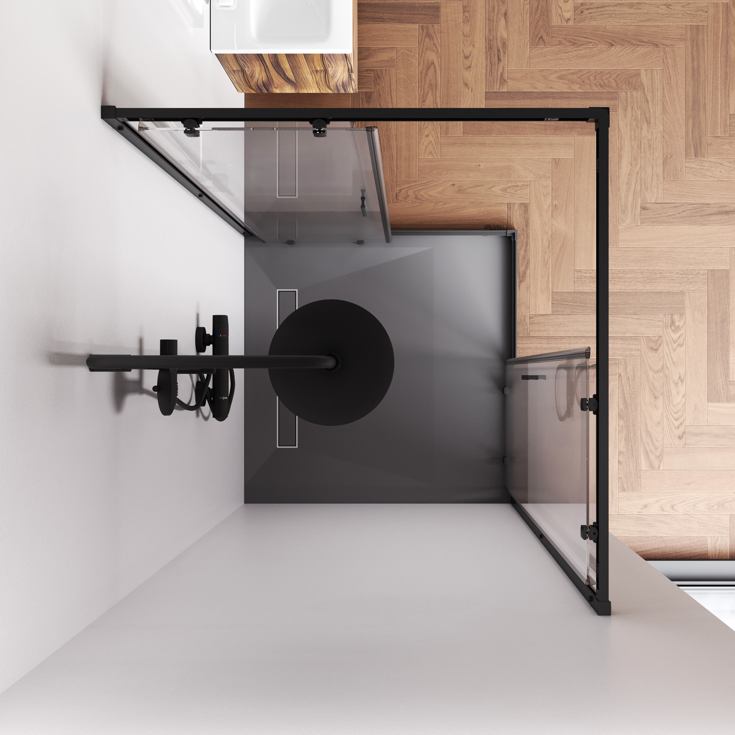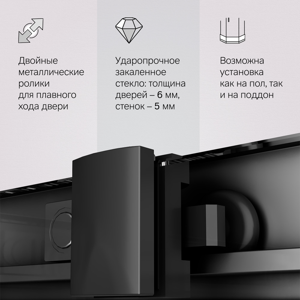 Душова огорожа виконана з ударостійкого загартованого скла. Товщина фіксованого скла 5 мм, товщина скла дверей 6 мм. Профілі огорожі виготовлені з надійного алюмінію із преміальним анодованим покриттям. Анодування забезпечує рівномірний насичений колір та особливу стійкість до механічних пошкоджень.