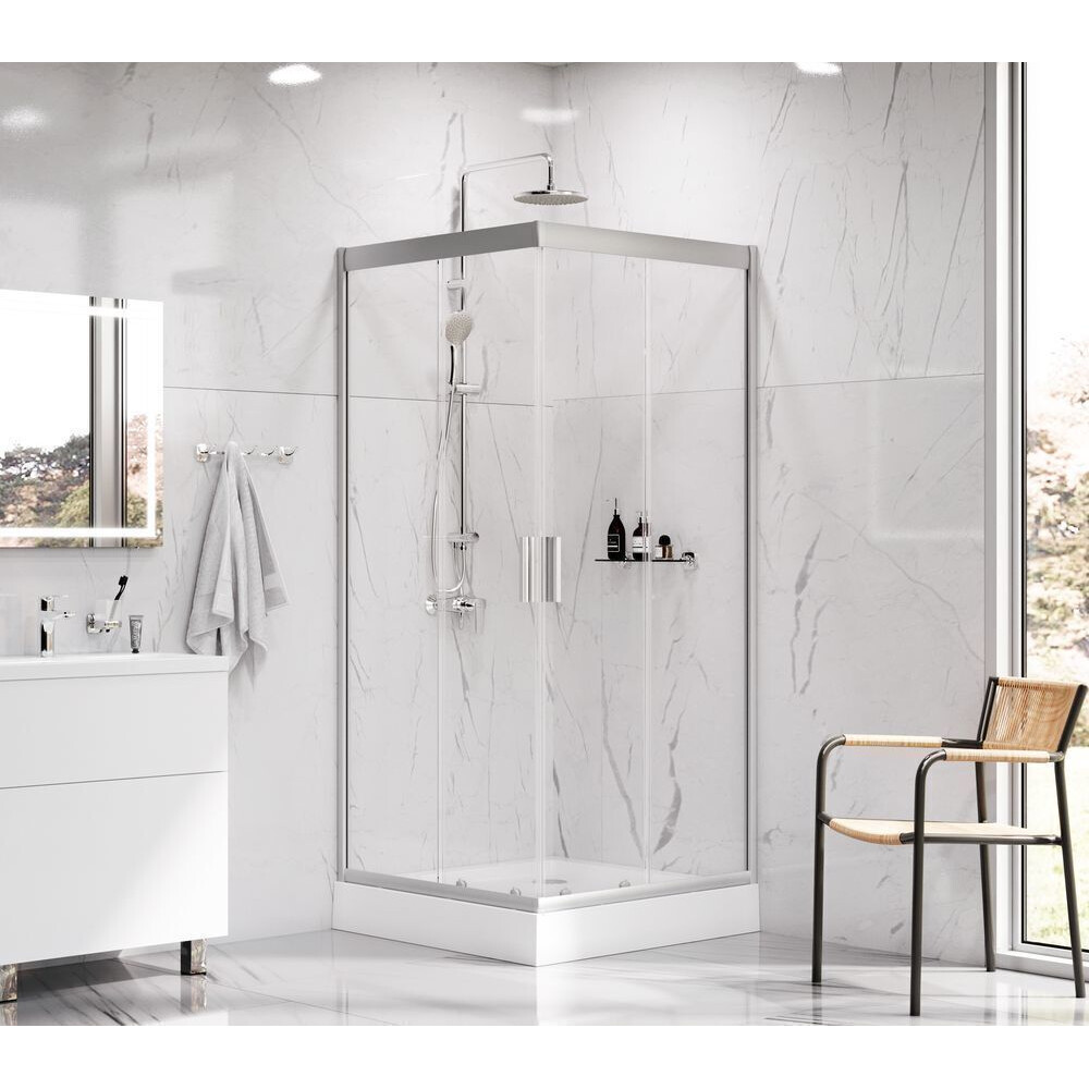 Душова огорожа виконана з ударостійкого загартованого скла. Товщина фіксованого скла 5 мм, товщина скла дверей 6 мм. Профілі огорожі виготовлені з надійного алюмінію з преміальним анодованим покриттям. Анодування забезпечує рівномірний насичений колір і особливу стійкість до механічних пошкоджень.