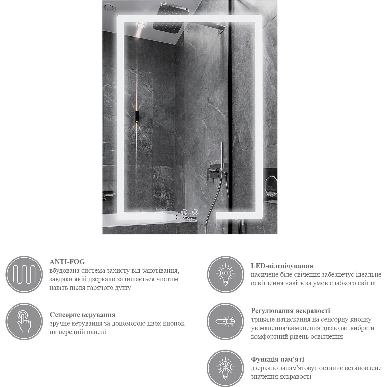 Дзеркало для ванної кімнати Kroner KRP Spiegel VR2-6080 з LED-підсвічуванням та антизапітнінням