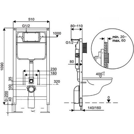 - Оцинковані сталеві опори рами із регулюванням висоти кріплення чаші унітазу від 320 до 560 мм.