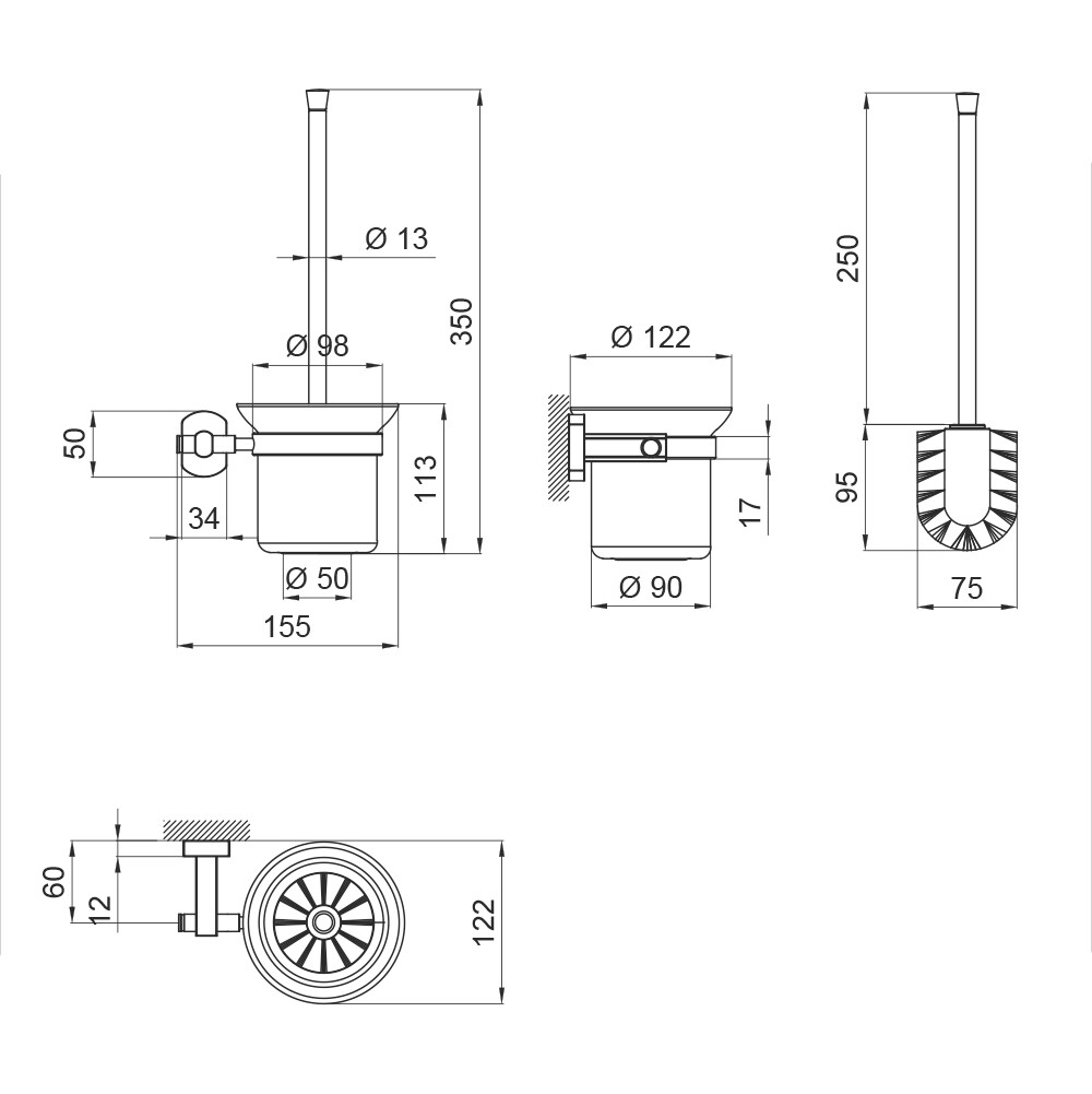 Єршик металевий з колбою Qtap Liberty CRM 1157 кріпиться на стіні на потрібній висоті. Прихований монтаж дозволяє зберегти обробку санвузла. Латунна ручка міцна, не гнеться, зручна у використанні. Колба виготовлена з матового скла, вставляється в латунний тримач. Щетини щітки із міцного пластику.