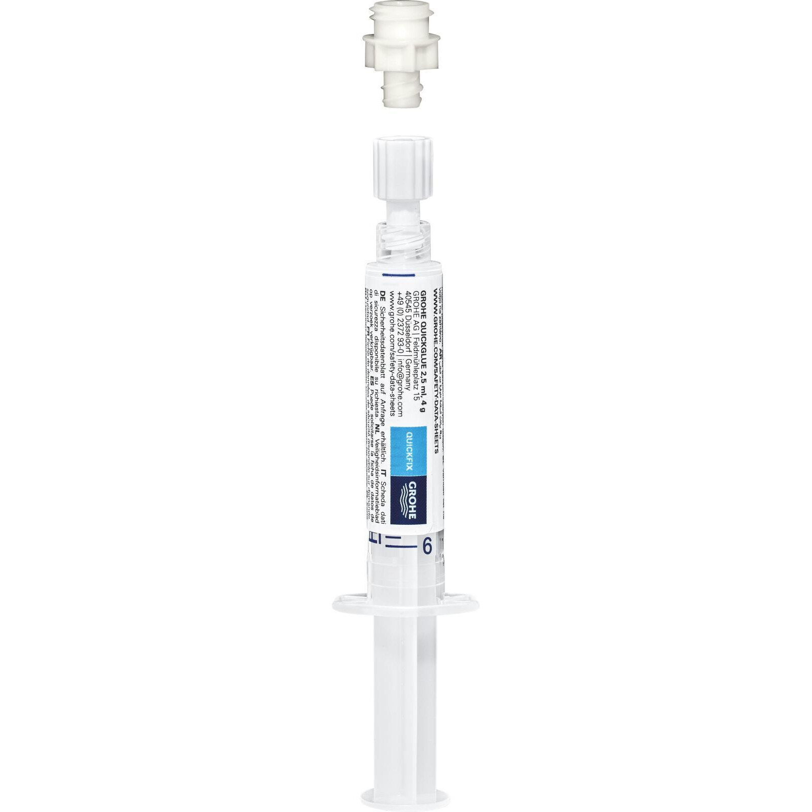 GROHE QuickGlue означає, що свердління та пошкодження плитки залишилися в минулому! Для найпростішого встановлення все, що вам потрібно, це набір QuickGlue для наших аксесуарів для ванної кімнати Start, Start Cube та Start Cosmopolitan QuickFix з однією монтажною пластиною (наприклад, кільце для рушників, гачок для халата або тримач для туалетного паперу). У комплект входить один шприц з клеєм плюс один перехідник для настінного кріплення аксесуара. Час затвердіння 24 години. Клей підходить для використання на плитці, мармурі, камені, склі, бетоні, пластику або металі (не підходить для шпалер, штукатурки та пластику PE, PTFE та PP). І, звичайно, ви можете легко зняти монтажну пластину, відклеївши її шпателем. GROHE QuickGlue – створення ідеального дизайну ванної кімнати ще ніколи не було таким простим!