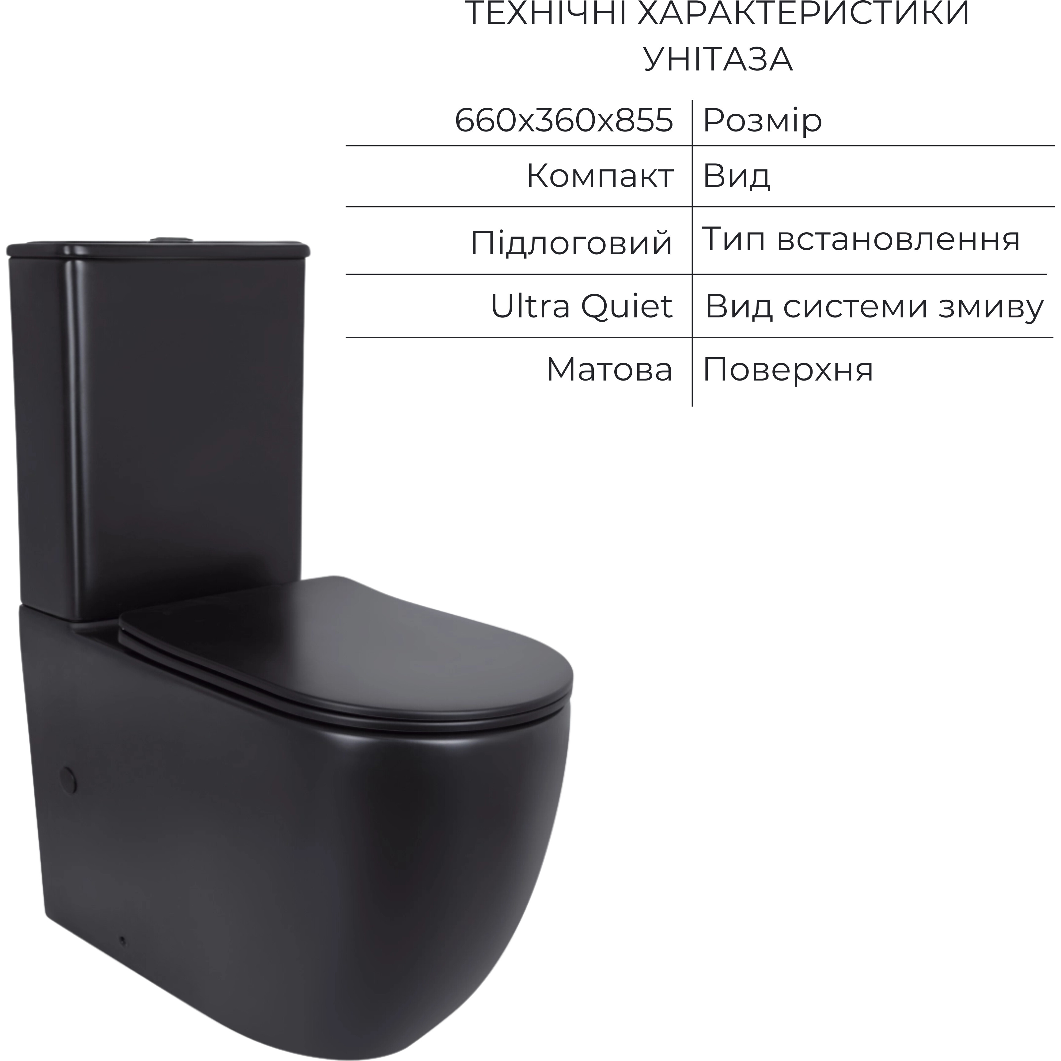 Безобідковий унітаз-компакт Qtap Robin Ultra Quiet QT13226083AMB (чорний матовий, воронкоподібний, з сидінням)