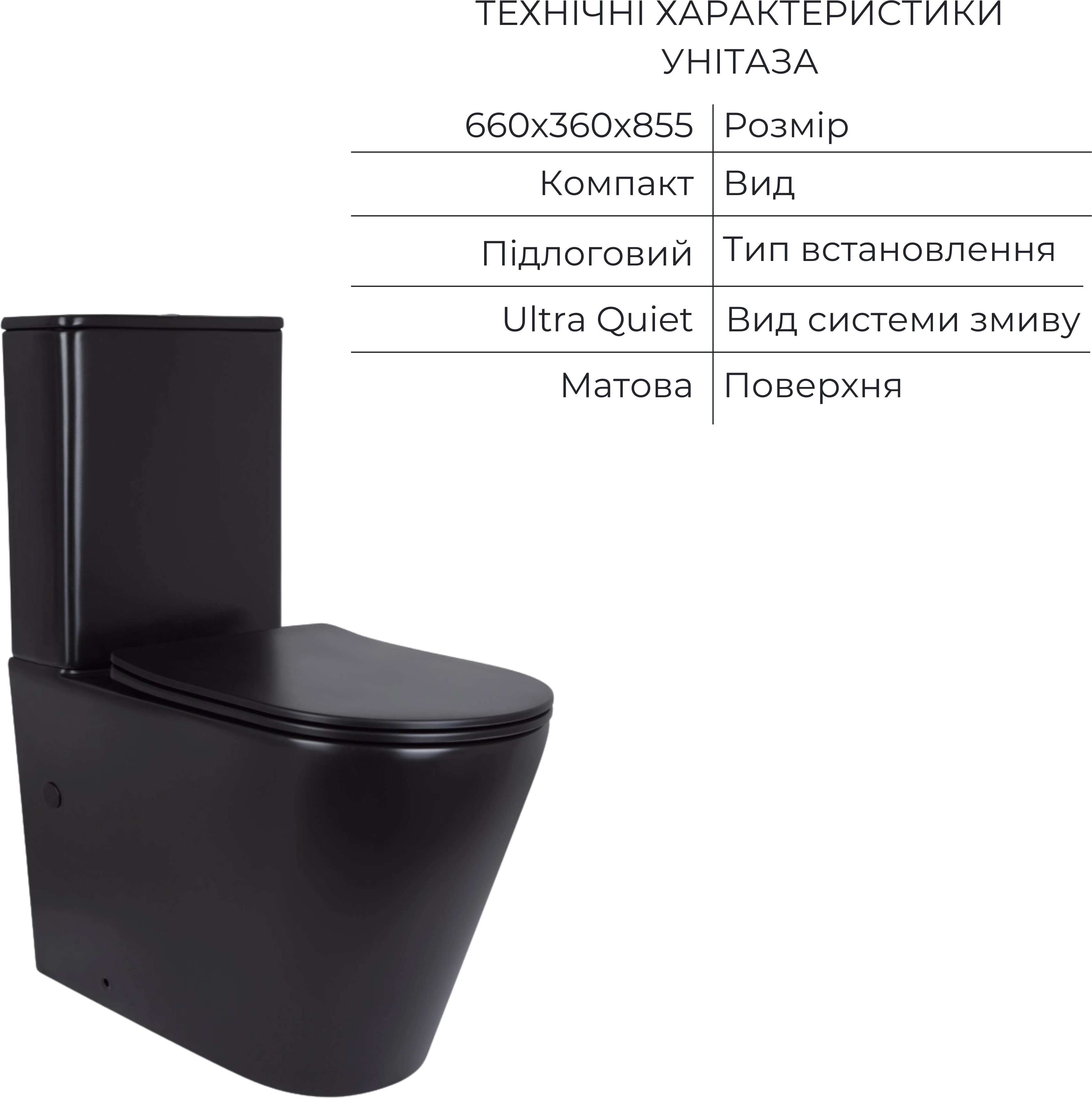 Безобідковий унітаз-компакт Qtap Scorpio Ultra Quiet QT14226088AMB (чорний матовий, воронкоподібний, з сидінням)