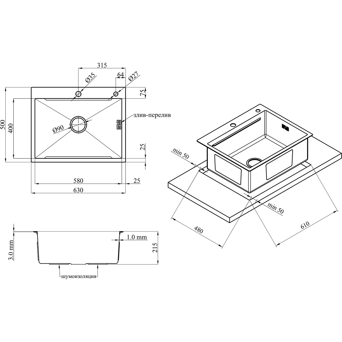- Шумоізоляція та антиконденсат. Мийка повністю покрита шумоізоляцією та антиконденсатом, що знижує шум при використанні та запобігає утворенню конденсату, захищаючи при цьому ваші меблі та кухонні шафи.