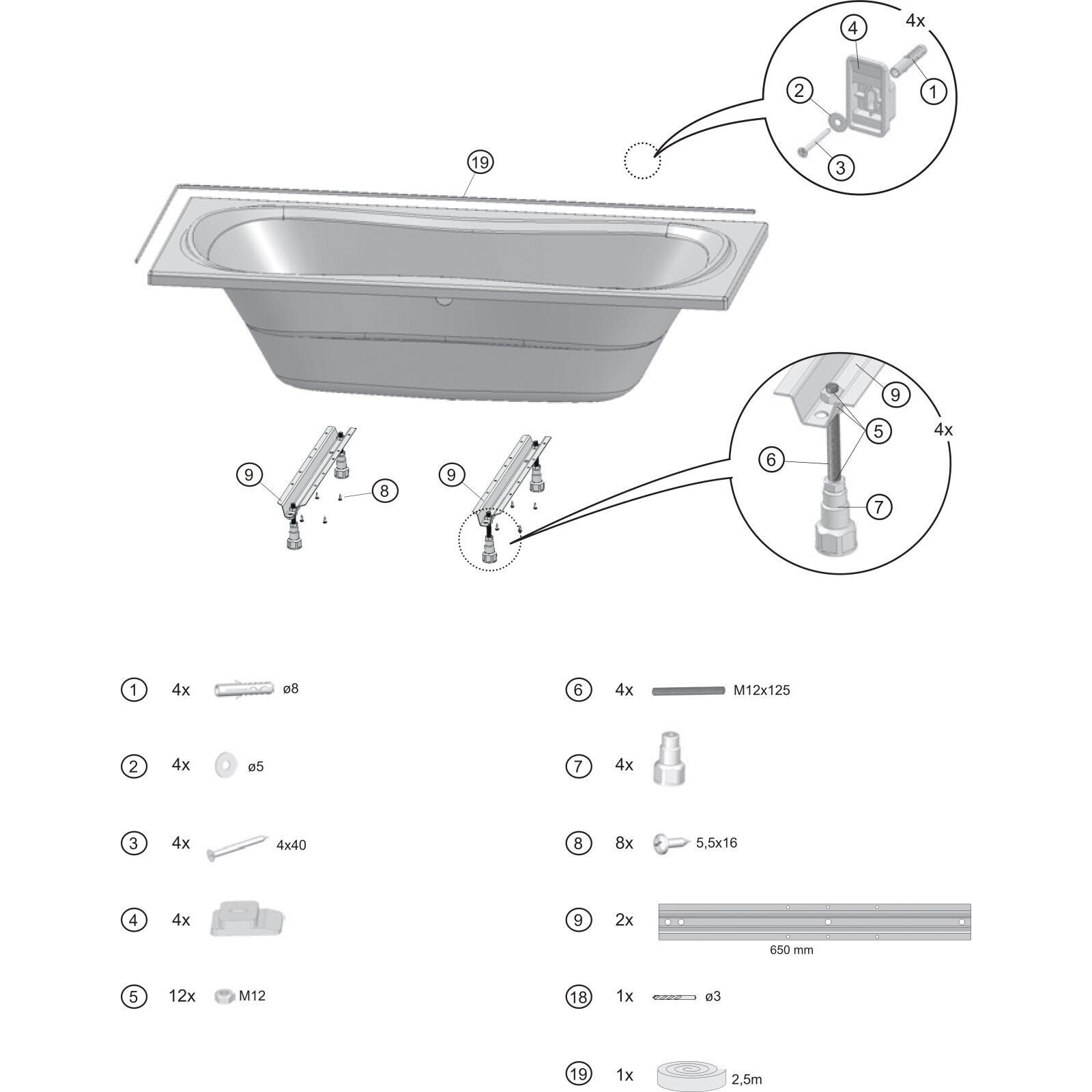 - Ніжки для ванни 75 U використовуються для вирівнювання ванни за рівнем, а їх встановлення відповідно до Інструкції по встановленню є умовою надання 10-річної гарантії на ванну RAVAK. Після чого легко можна провести обробку та облицювання ванни.
