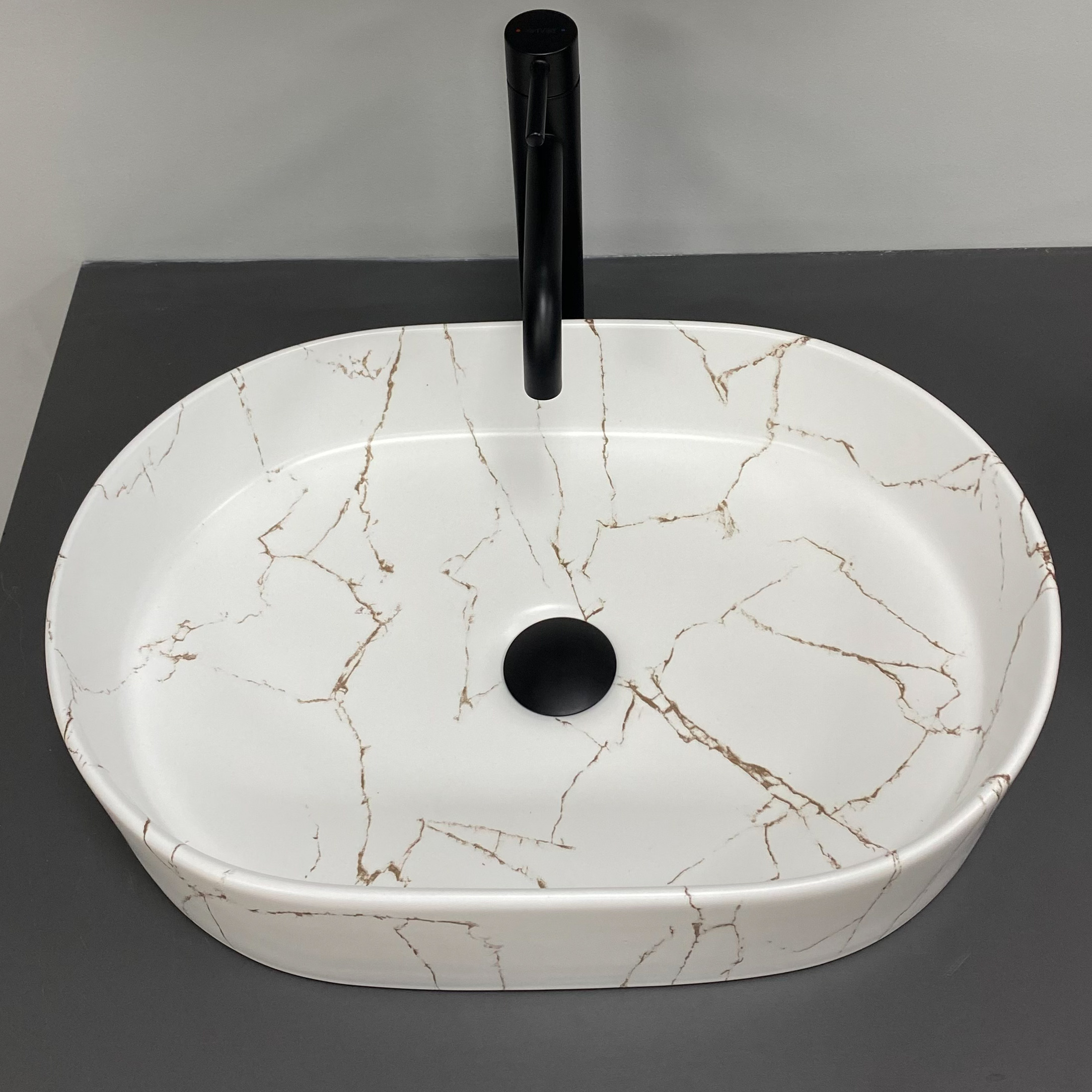 Накладні раковини серії VBI VERONA користуються високим попитом. Доступні в різних розмірах та кольорах, у глянсовому або матовому виконанні. Накладна за способом встановлення раковина має класичну овальну форму з чіткими лініями. Це дозволяє підібрати змішувач як круглої, так і квадратної форми. Модель VBI VERONA 50 GOLD MARMO – має унікальний малюнок, а глянсове покриття відбиває світло, створюючи враження збільшення та яскравості.