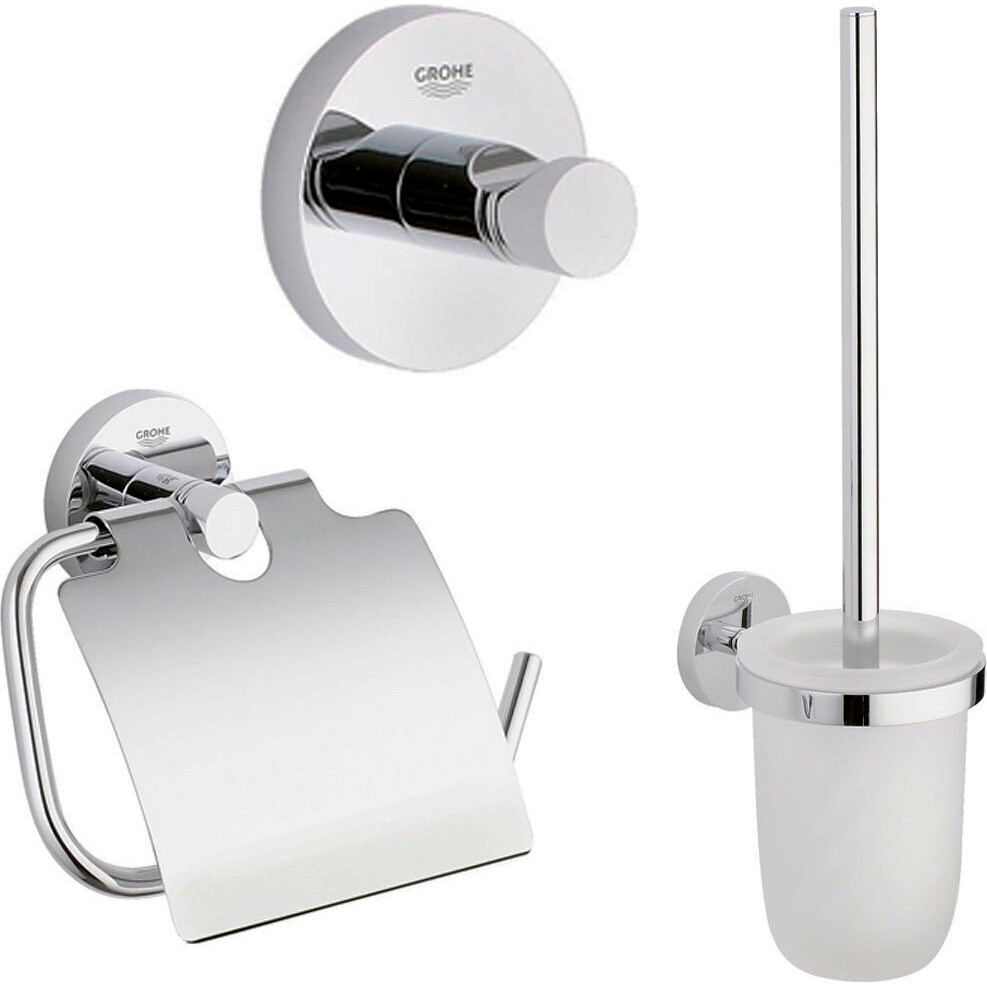 Набор аксессуаров Grohe Essentials 40407001 - идеальное дополнение к вашей стильной и гармоничной ванной комнате. Набор включает в себя крючок для одежды (40364001), держатель туалетной бумаги с крышкой (40367001), ершик для унитаза с колбой (40374001). Каждая деталь покрыта прочным и легким в уходе хромированным покрытием Grohe StarLight, которое будет блестеть годами и неприхотливо в уходе.