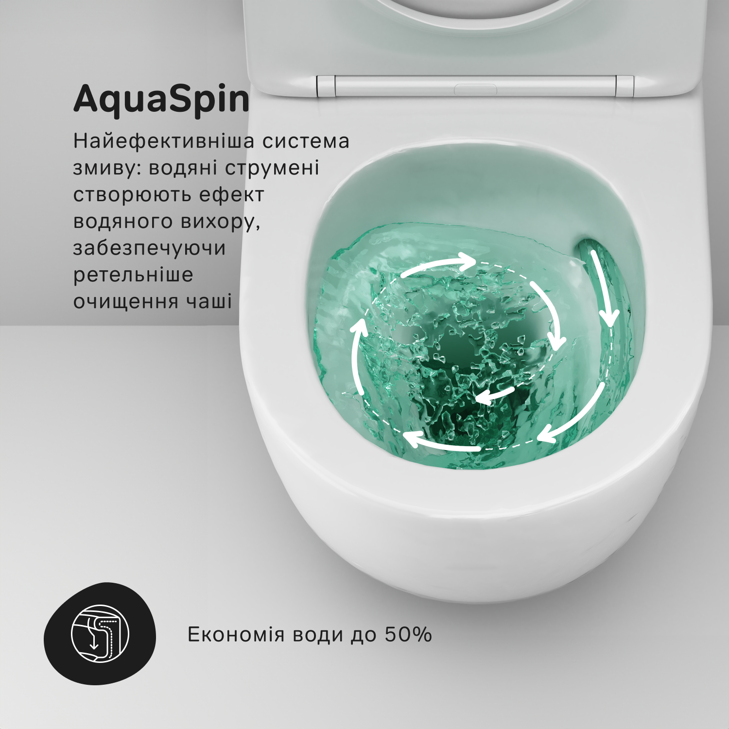 Подвесной унитаз Like c технологией смыва AquaSpin. Новая инновационная система использует вихревой поток воды для самого эффективного очищения чаши унитаза.