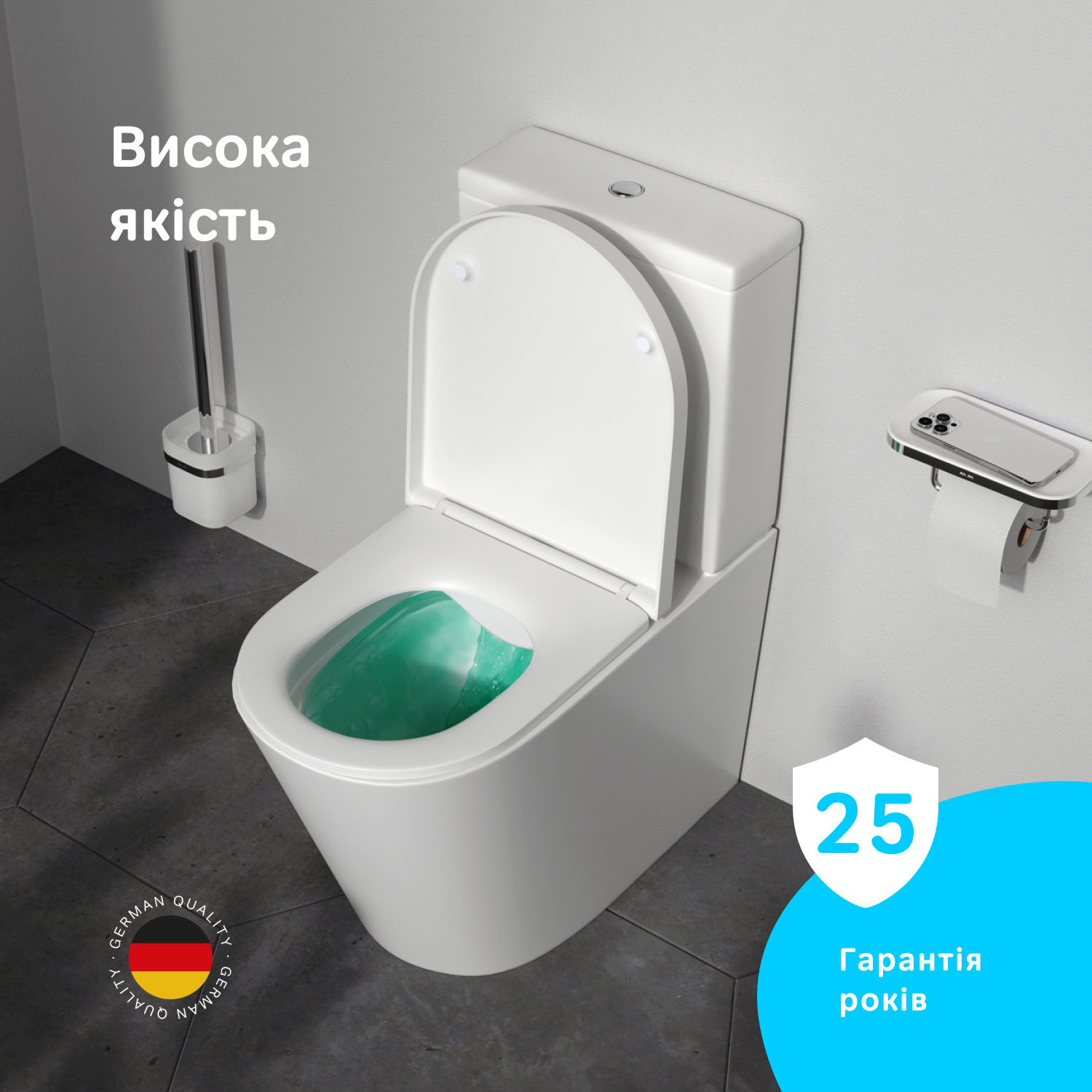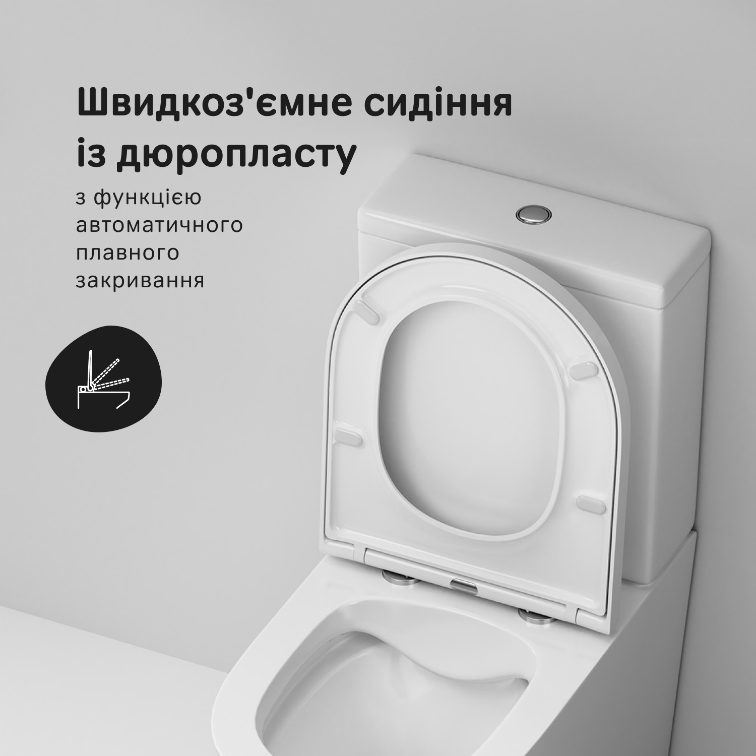 В комплект входит сиденье с механизмом плавного опускания, выполненное из прочного дюропласта. Надёжные крепления из нержавеющей стали рассчитаны на более чем 100 000 циклов закрывания, гарантируя долговечность и комфорт в использовании.
