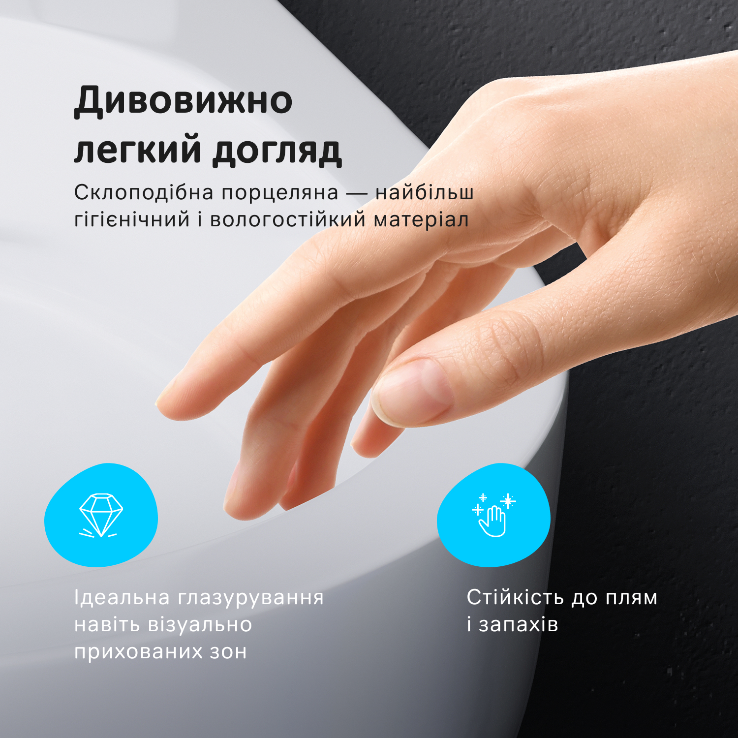 Сиденье из дюропласта сочетает комфорт с устойчивостью к царапинам. Надёжный механизм закрывания выдерживает более 100 000 циклов, гарантируя долгий срок службы. На керамику предоставляется гарантия 25 лет.