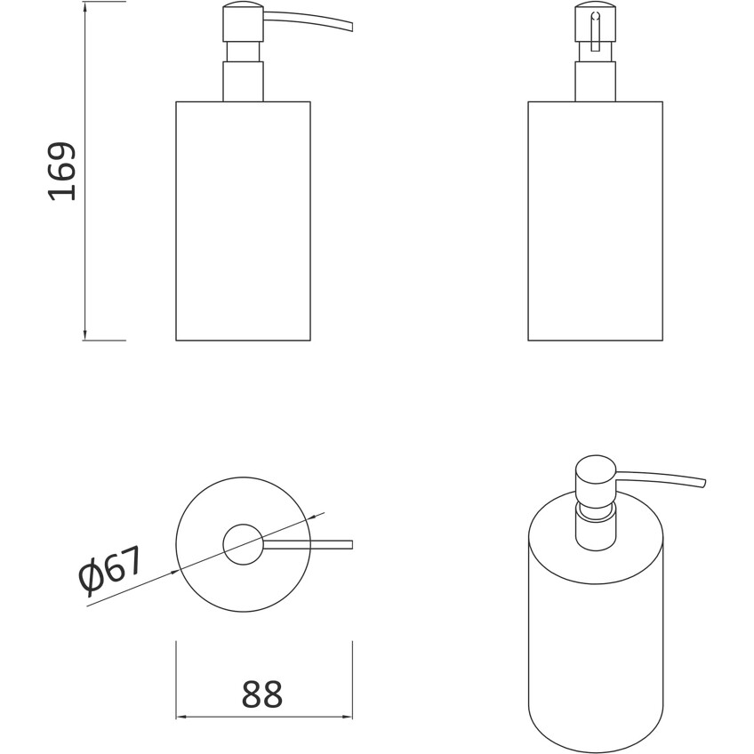 Дозатор для мыла: отдельностоящий, круглый, объём 300 мл, поликарбонат и нержавеющая сталь, гарантия 2 года.