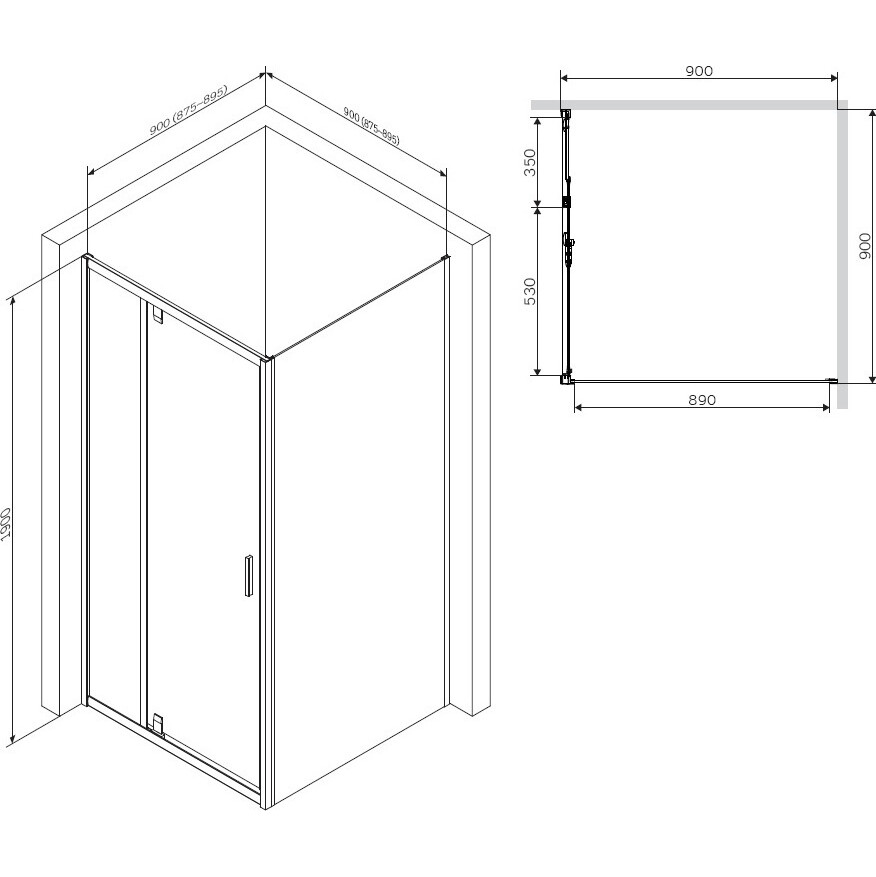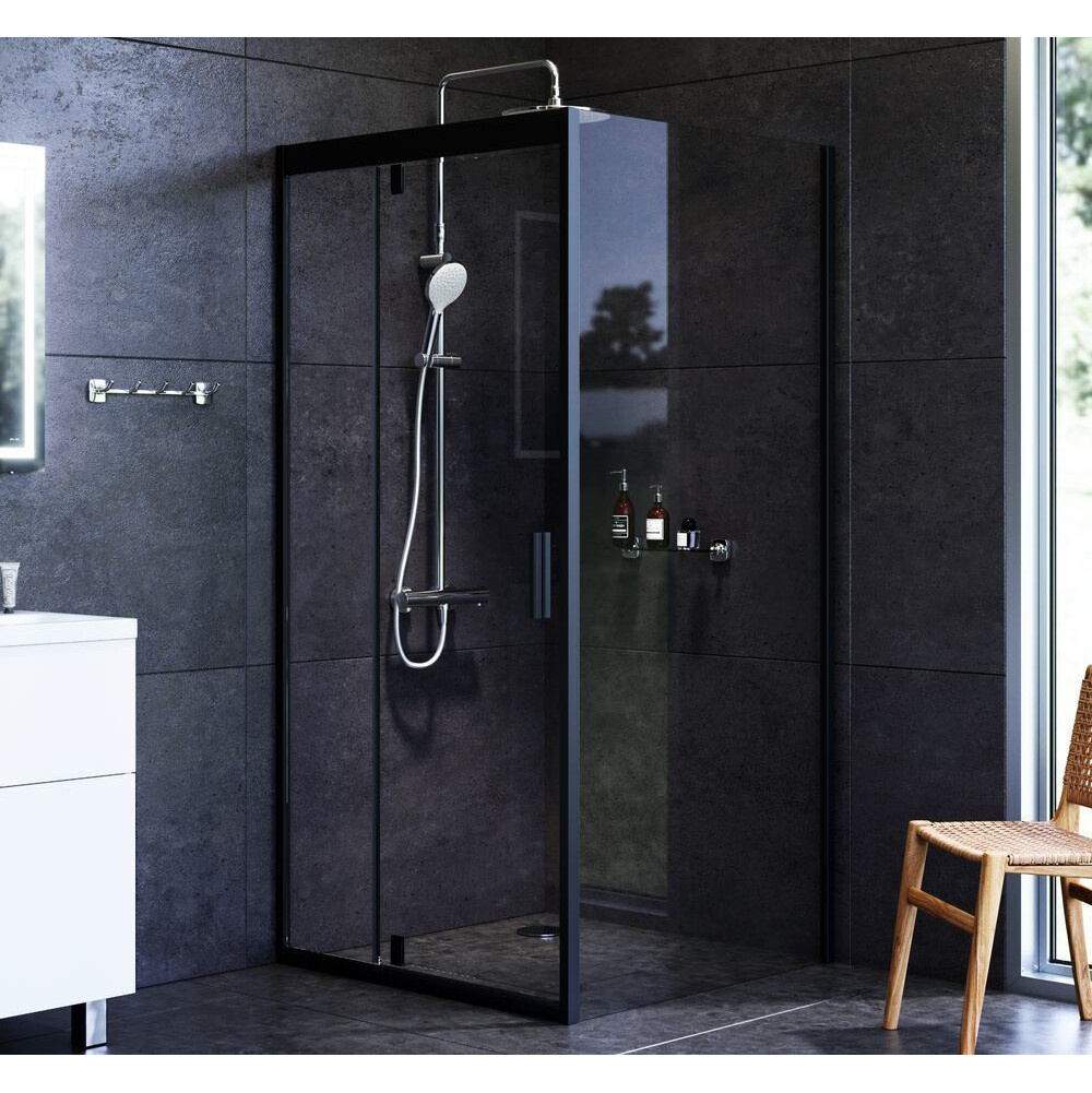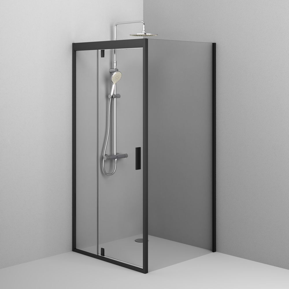 Квадартное душевое ограждение с одной распашной дверью и с одним неподвижным боковым стеклом. Цвет профиля черный, стекло прозрачное.