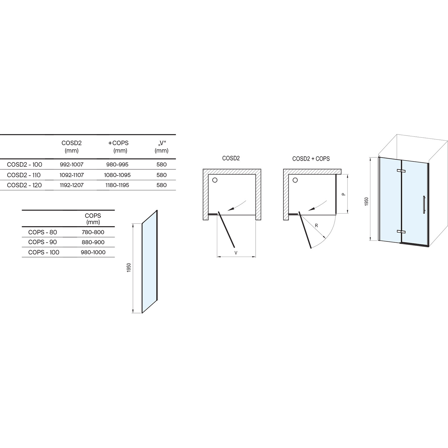 Душевая кабина состоит из двух отдельных изделий: душевой двери (COSD2 120) и фиксированной панели (COPS 100). Повернув душевую дверь на 180°, вы получаете вариант открывания влево или вправо. Изделие предназначено для установки в кафельном углу ванной комнаты на душевых поддонах Ravak Gigant Pro, Gigant Pro Flat, Gigant Pro Chrome или непосредственно на полу со встроенным душевым каналом или точечным сливом. Опорная планка экрана входит в комплект дверцы.