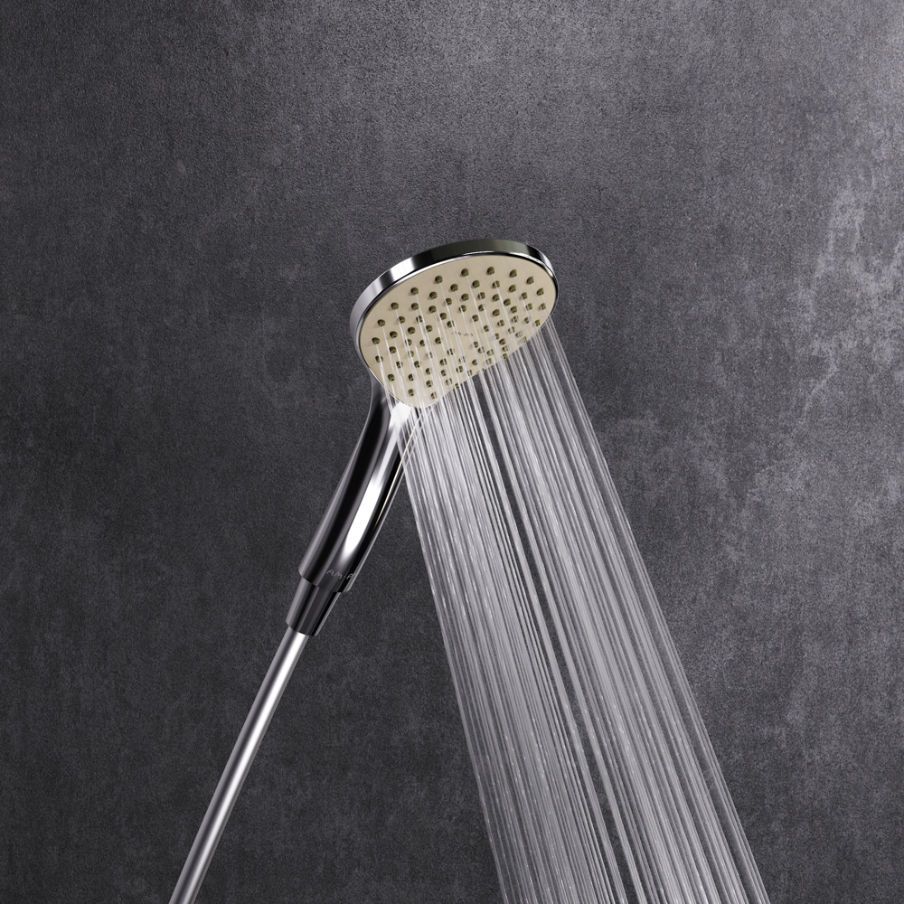 Тотальный дизайн в действии: все детали душевой системы – от пропорций ручного и верхнего душей до рисунка расположения форсунок на лейках – подчинены единой дизайн-концепции коллекции Sunny.