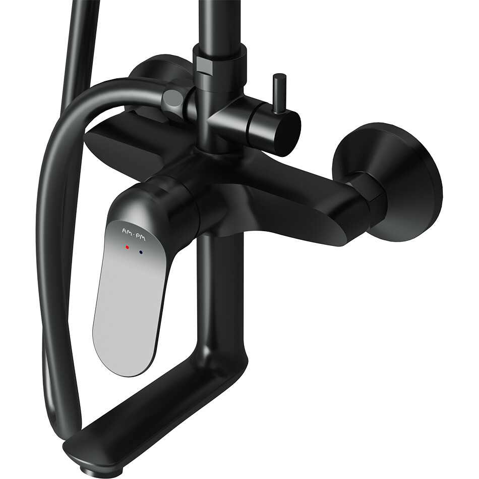 Тотальный дизайн в действии: все детали душевой системы – от пропорций ручного и верхнего душей до рисунка расположения форсунок на лейках – подчинены единой дизайн-концепции коллекции Sunny. Смесители коллекции Sunny отмечены престижной международной наградой Good Design. Стильный дизайн смесителя для ванны/душа с функциональным поворотным изливом легко впишется в современную ванную комнату. Диаметр душевых леек (верхний душ 220 мм и ручной душ 110 мм) позволит ощутить преимущества тропического душа даже в стандартной ванной тогда как увеличенная длина шланга 1750 мм обеспечит свободу движений во время принятия душа. Продуманные детали для удобства использования: телескопическая поворотная штанга регулируется по высоте в диапазоне от 1030 до 1460 мм обеспечивая комфорт для людей любого роста. Черный цвет как нельзя лучше подчеркивает изящество силуэтов смесителя и душевой системы добавляя роскошь интерьеру ванной комнаты.