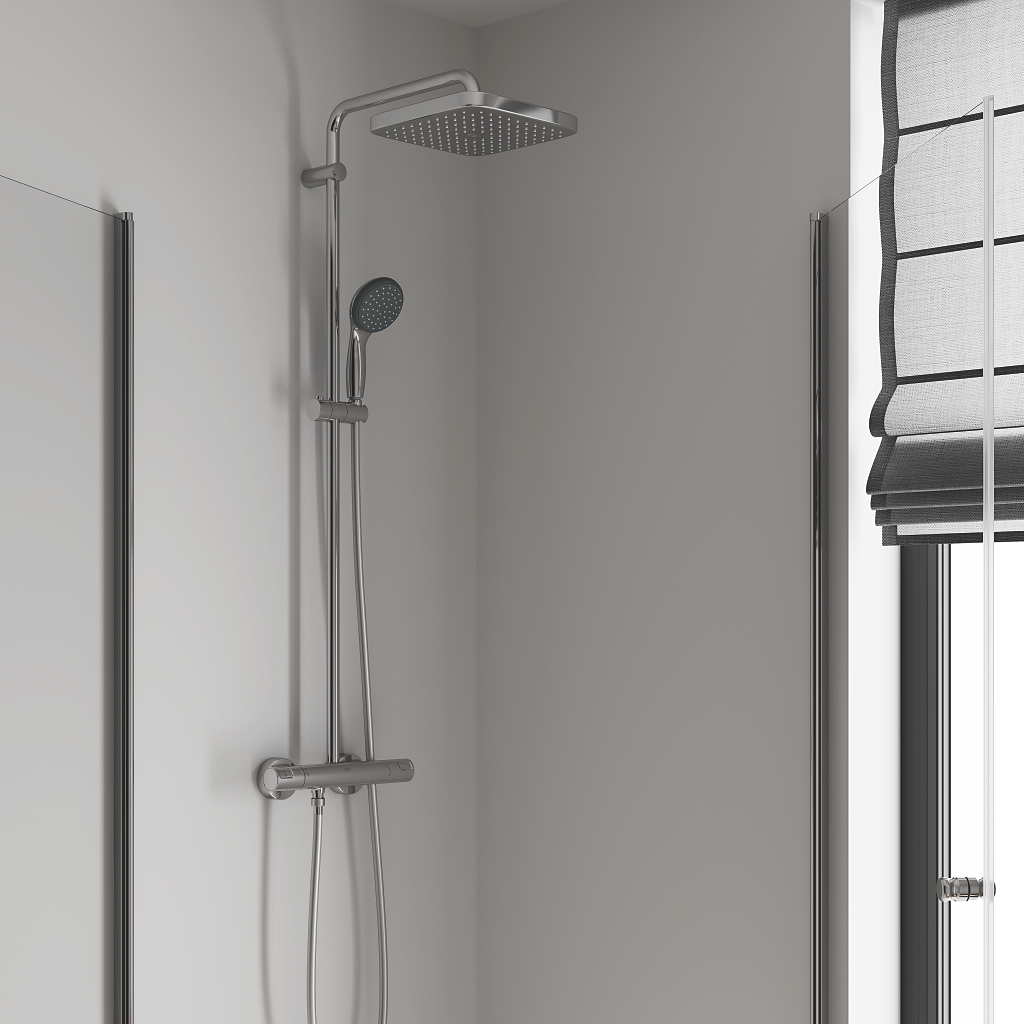 Душевая система Grohe QuickFix Vitalio Start System 250 Cube 26696000 - идеальный выбор для вашей современной ванной комнаты. Она сочетает в себе стильный дизайн и высокий функционал. Основным преимуществом этой системы является термостат, благодаря которому подача воды будет всегда заданной температуры. Таким образом установив температуру например 38 градусов Вы будете получать душевую струю именно такой температуры, а термостат будет сглаживать скачки давления в магистрали холодной или горячей воды. Также эта система имеет возможность наслаждаться различными видами струй. Ручной душ диаметром 100 мм предлагает два типа струи: нежную, расслабляющую струю Rain и крепкую струю Jet. Переключатель позволяет легко переключаться между ними, предоставляя вам возможность выбора под свое настроение. Регулировка ручного душа и шланга Vitalioflex Comfort осуществляется с помощью скользящего элемента, что обеспечивает удобство в пользовании. Душевая система имеет прочное хромированное покрытие GROHE Long-Life Shine, которое придает ей изысканный блеск и обеспечивает длительный срок службы.