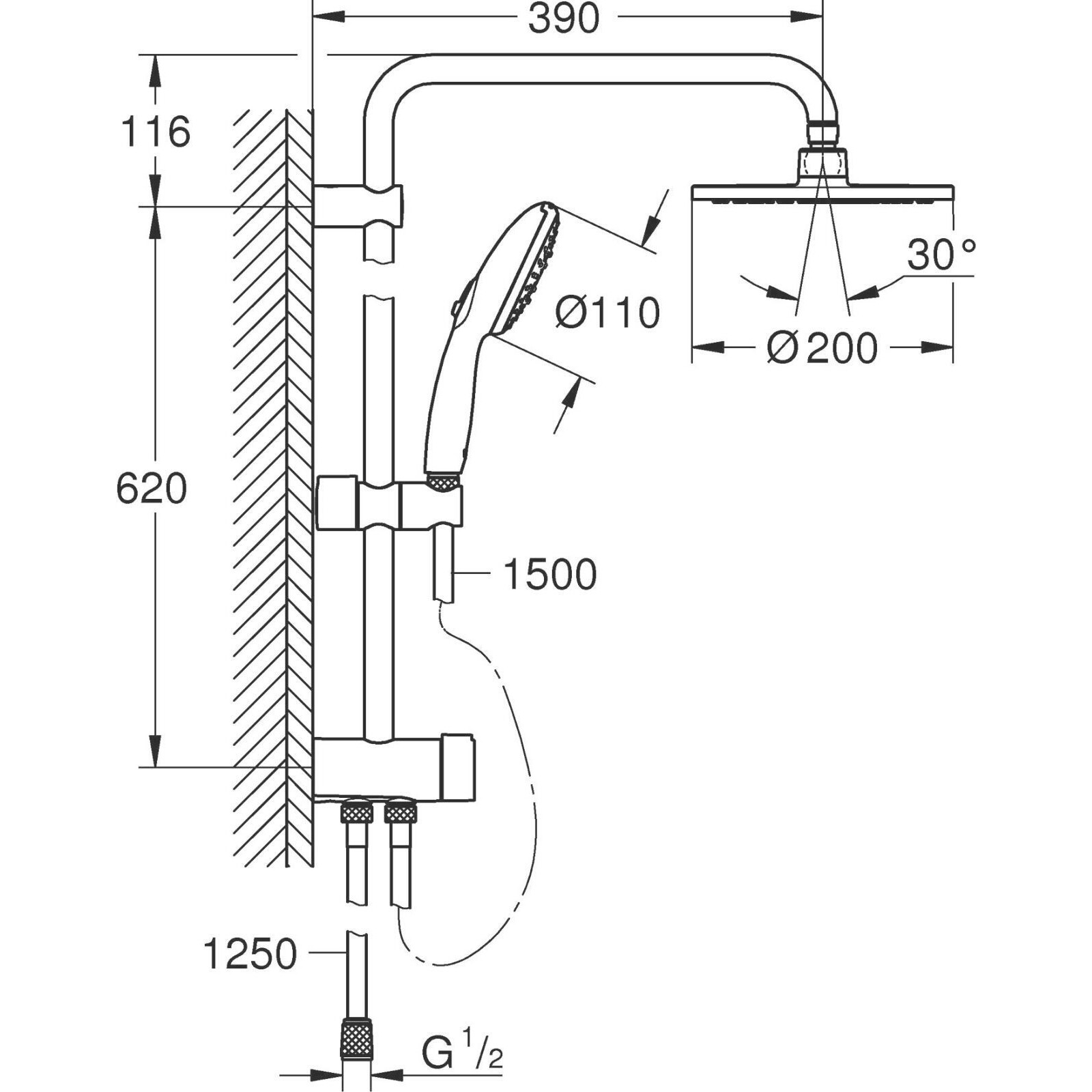 Душевая система Vitalio Start 200 Flex - это простой способ достичь блестящей эффективности и комфорта во время ежедневного принятия душа. Внешняя система для настенного монтажа состоит из 200-мм верхнего душа, 110-мм ручного душа, переключателя для легкого переключения между верхним и ручным душем, душевой стойки с 390-мм душевым кронштейном и скользящим элементом для регулировки ручного душа, а также шланга 1500 мм и 1250 мм. Верхний душ предлагает мягкий, расслабляющий режим Rain или SmartRain, который обеспечивает аналогичный уровень комфорта, но с пониженным потоком. Ручной душ имеет силиконовое кольцо ShockProof для защиты от падений и ударов. Он имеет 3 режима распыления: мягкий Rain, бодрящий Massage и мощный Jet-струя. Все они легко включаются и меняются с помощью инновационного переключателя GROHE SmartSwitch на задней части душевой лейки. GROHE DreamSpray гарантирует, что поток из каждой форсунки будет одинаковым, что сделает ваш душ максимально комфортным и приятным. Силиконовые форсунки SpeedClean предназначены для легкого удаления известкового налета простым протиранием. Прочное и простое в уходе покрытие GROHE Long-Life сохраняет душевую систему в идеальном виде на протяжении всей жизни. Простая установка и гибкое подключение с помощью шланга длиной 1250 мм делает эту систему совместимой с имеющимся смесителем, поэтому вы можете обновить ванную комнату в кратчайшие сроки.