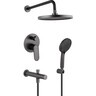 Комплектация: Смеситель, излив, лейка для верхнего душа, кронштейн для верхнего душа, лейка для ручного душа, душевой шланг, кронштейн для ручного душа, крепление, инструкция.