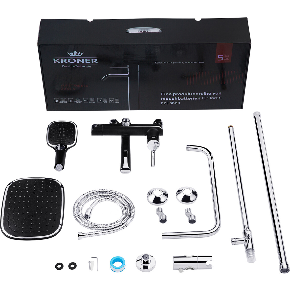 Душевая система Kroner KRP Essen - SCH063 представляет собой стильное сочетание хромированного и черного цветов, придающих ей современный вид. Включает в себя четыре режима струи: три режима для ручного душа и один для верхнего душа. Изготовлена из прочного материала - латуни и ABS пластика, что обеспечивает долгий срок службы. Лейки имеют прямоугольную форму. Эта душевая система предоставляет комфорт и функциональность в одном изысканном устройстве.
