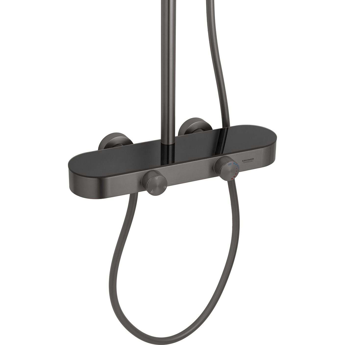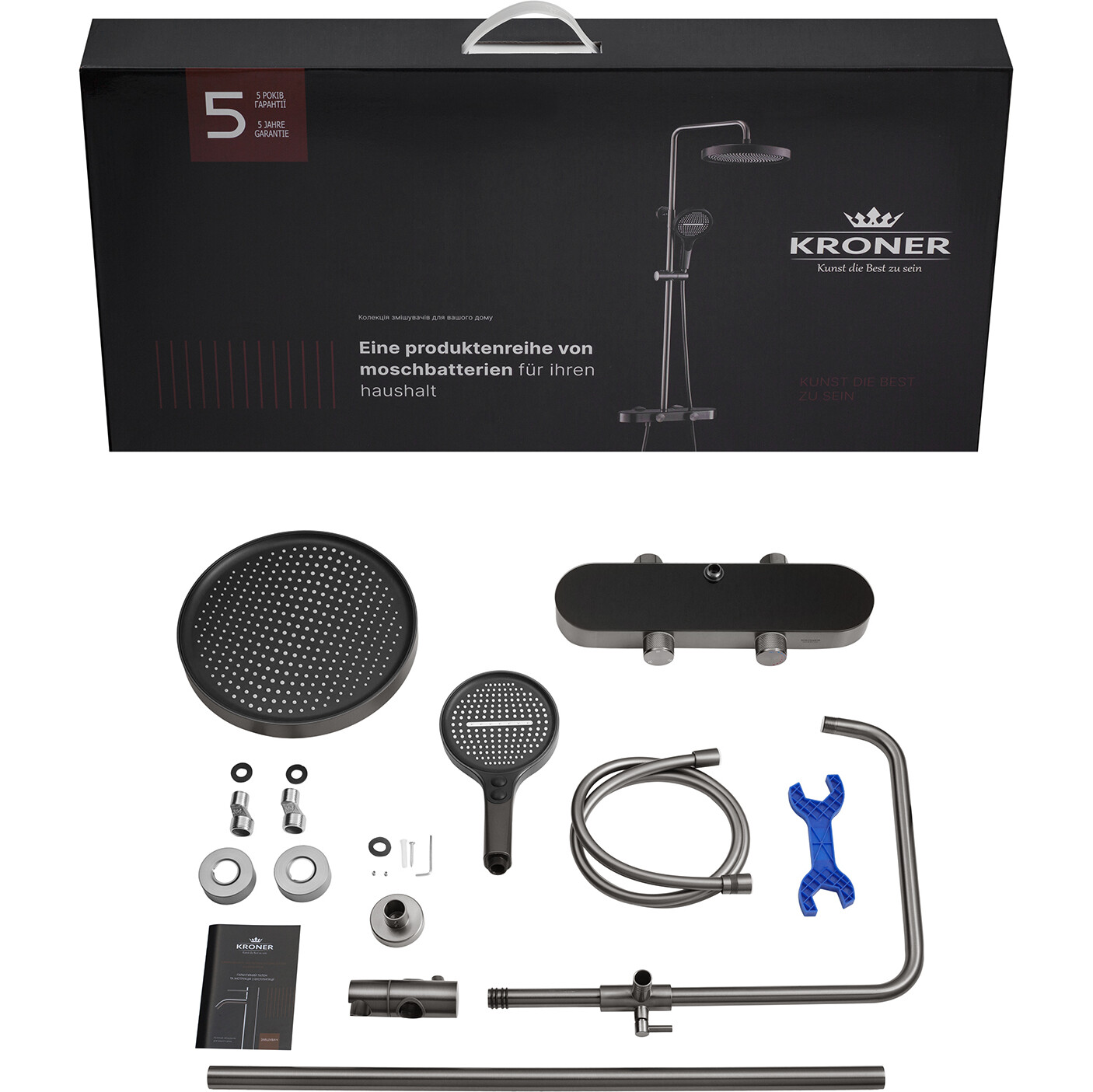 Конструкция выполнена из латуни и прочного ABS пластика, что гарантирует долговечность, устойчивость к коррозии и механическим повреждениям. Двухслойное никель-хромовое покрытие в сочетании с графитовым цветом делает систему не только надёжной, но и эстетически привлекательной.