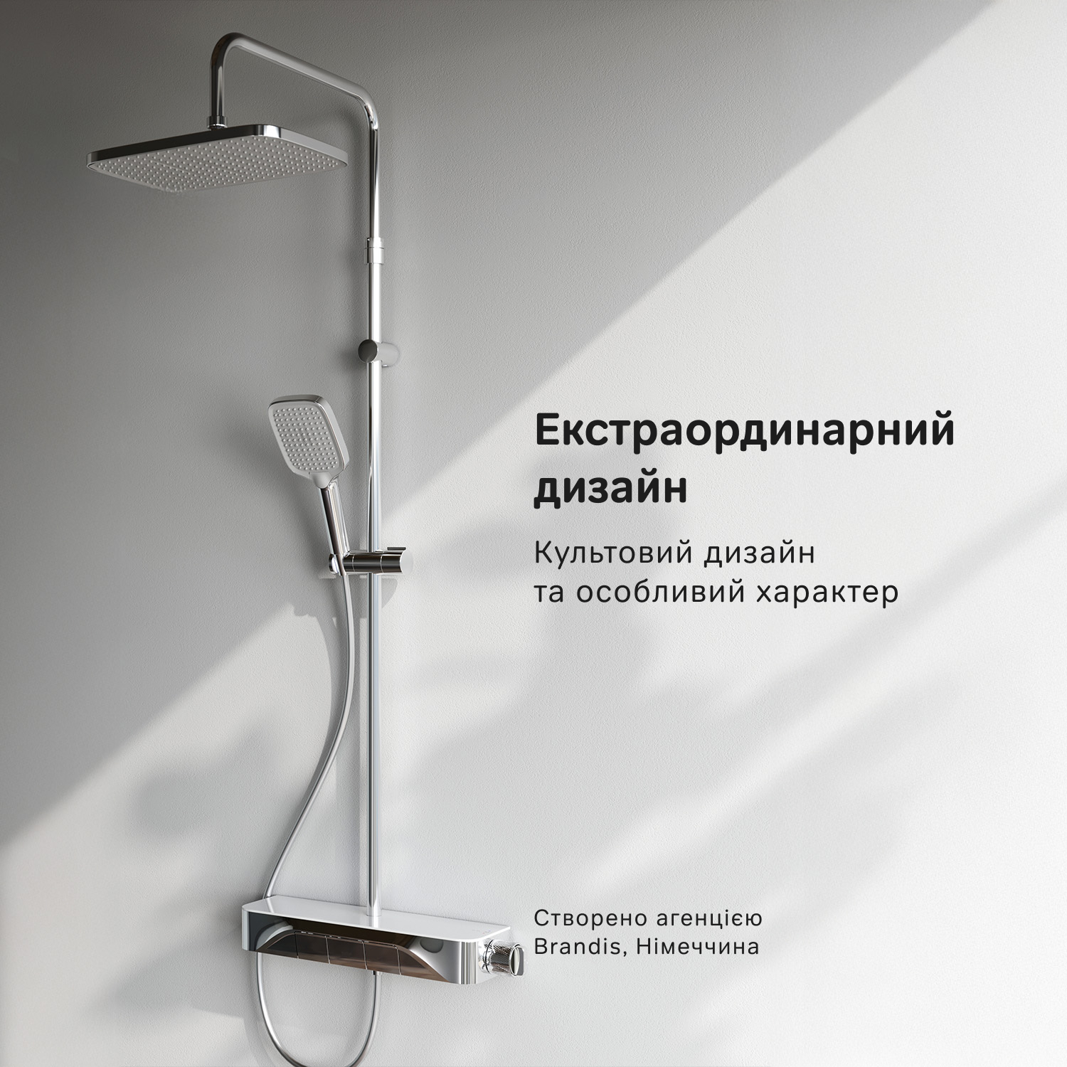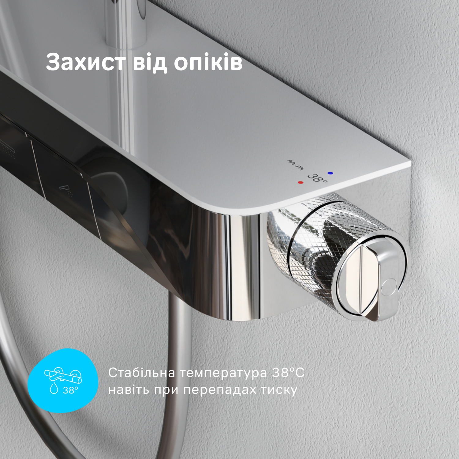 Интуитивно понятное управление: всего одна удобная ручка для настройки температуры и потока воды. Благодаря специально спроектированной эргономичной ручке вы можете управлять душевой системой даже с мыльными руками. Переключение потоков воды осуществляется нажатием клавиши.