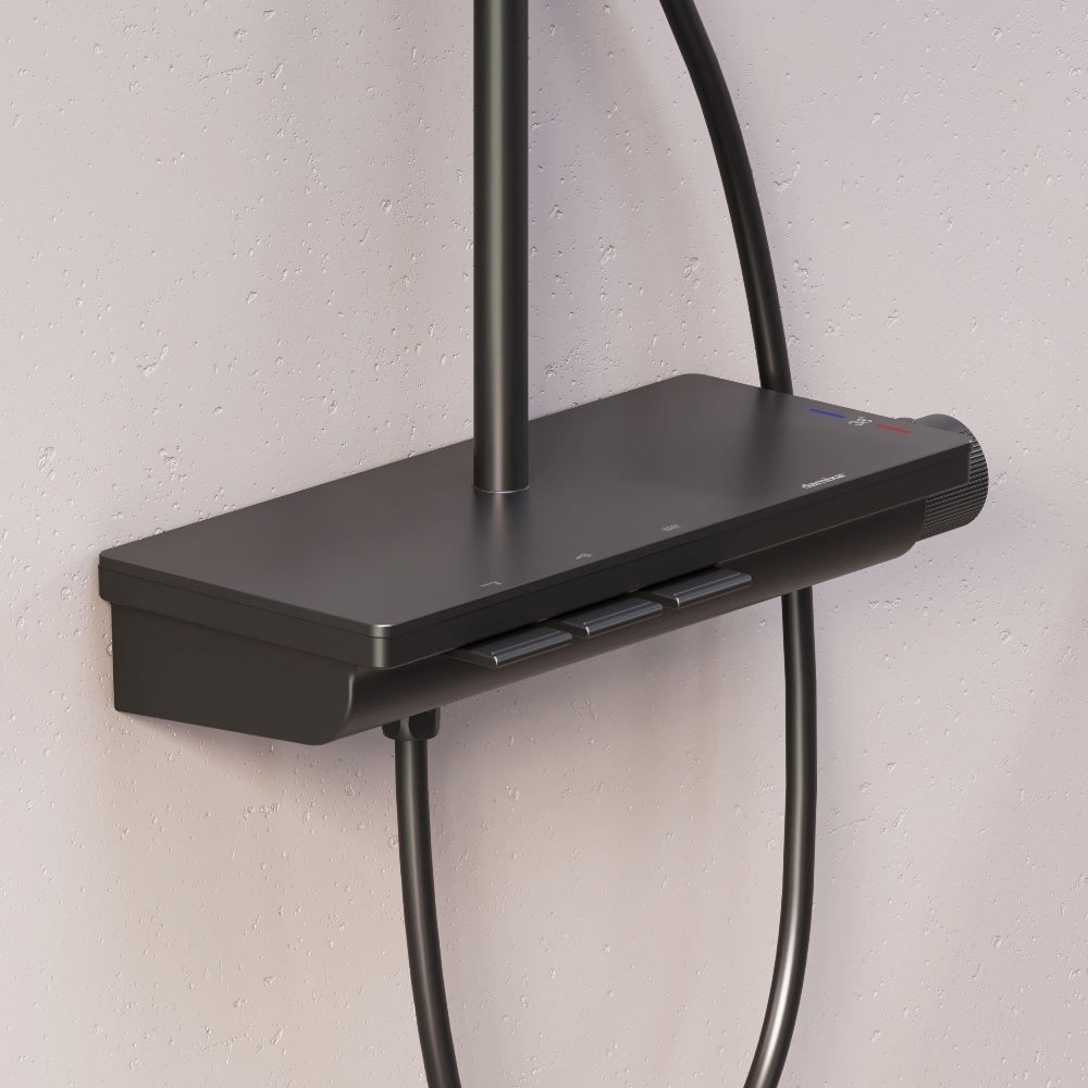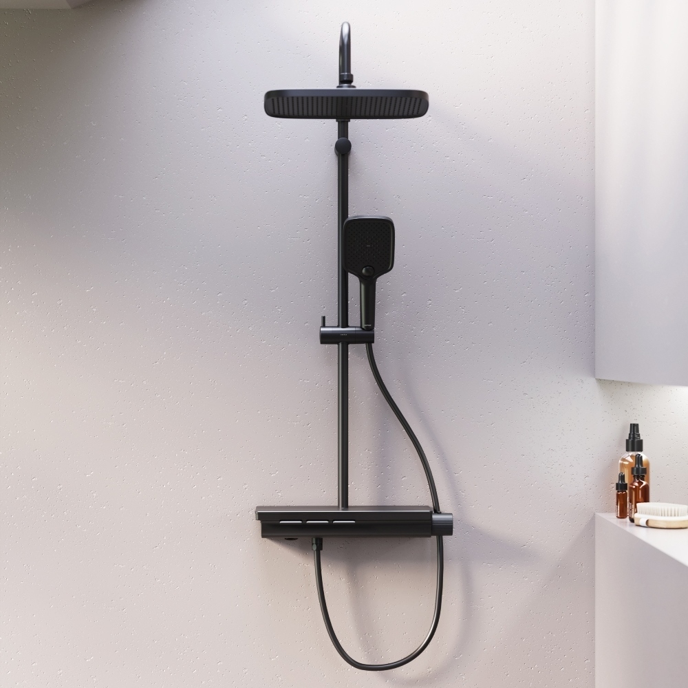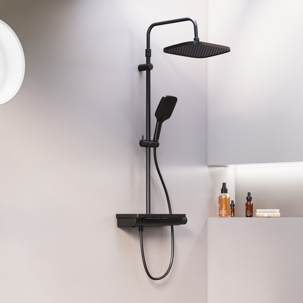 Мягкие геометричные формы трендовое черное покрытие и солидное датское качество – идеальное сочетание для современной ванной комнаты. Простая и минималистичная на первый взгляд душевая система Gala чрезвычайно функциональна и удовлетворит даже самого искушенного пользователя. Максимальная безопасность: термостатический картридж 35 мм обеспечивает точную настройку температуры и напора воды. Благодаря телескопической штанге с диапазоном регулировки в 400 мм водные процедуры будут одинаково комфортны абсолютно для всех членов семьи. Непревзойдённый комфорт и удобство: благодаря стильной полочке из ударопрочного закаленного стекла вы можете хранить все необходимые вещи под рукой. Настоящее SPA прямо у вас дома: наслаждайтесь увеличенным размер тропической лейки с регулируемым углом наклона (220 мм) и 3-мя режимами ручного душа. Возможность включения 2-х или 3-х режимов одновременно сделает ваши ежедневные ритуалы незабываемыми. Простота и минимализм во всем: переключайте потоки воды между изливом ручной и тропической лейкой нажатием всего одной кнопки. Специальное PVD-покрытие гарантирует чрезвычайную прочность душевой системы. Матово-черная поверхность не выцветает с годами и устойчива к механическим повреждениям загрязнениям и отпечаткам пальцев.