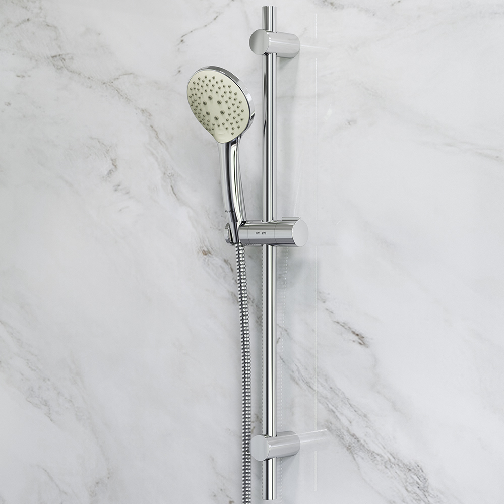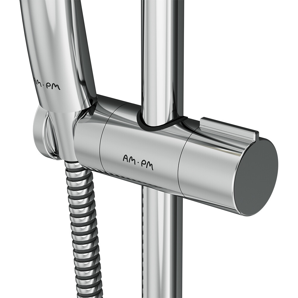 Продуманные детали для удобства использования: шарнирное соединение защищает душевой шланг от перекручивания, регулируемый в трех плоскостях держатель ручного душа, функция Rub&Clean для легкой очистки душевых форсунок.