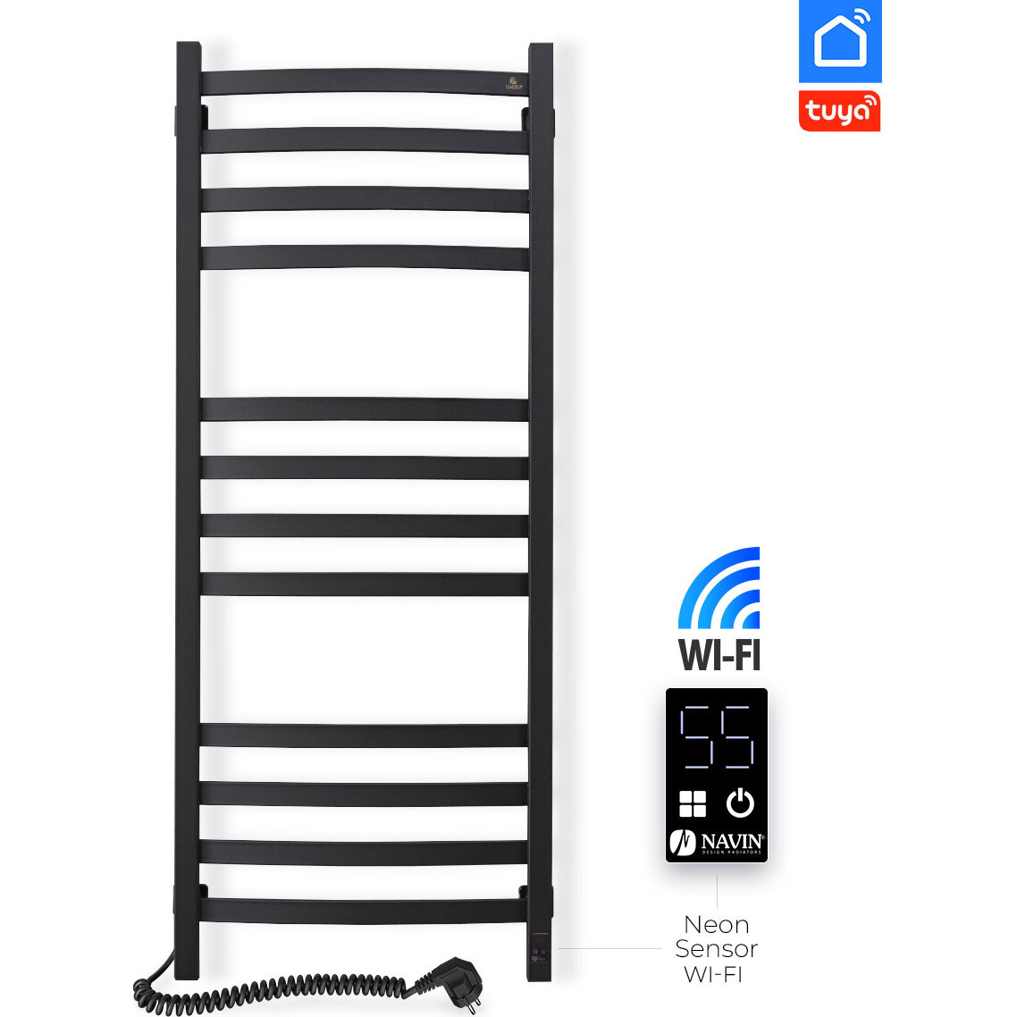 Технические характеристики электрического полотенцесушителя Navin Avalon 480х1200 Sensor с Wi-Fi (расположение шнура с вилкой — справа, цвет – черный муар) изготовлен из углеродистой стали, которая отличается высоким качеством и прочностью.