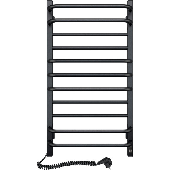 Электрический полотенцесушитель NAVIN Грандис — яркий образец минимализма. Модель имеет боковые коллекторы (стойки), выполненные из профильной квадратной трубы 30х30 мм, а перемычки — из круглых трубок 20х20 мм. Это создает простую, строгую и бесконечно привлекательную геометрическую гармонию. Полотенцесушитель Navin Грандис 480х800 Sensor (расположение шнура с вилкой — слева; цвет — черный муар) от украинского производителя NAVIN изготовлен из углеродной стали, которая отличается высоким качеством и прочностью. Модель имеет надежное порошковое покрытие. Толщина стенок боковых коллекторов (стоек) и перемычек сушилки составляет 1,5 мм.