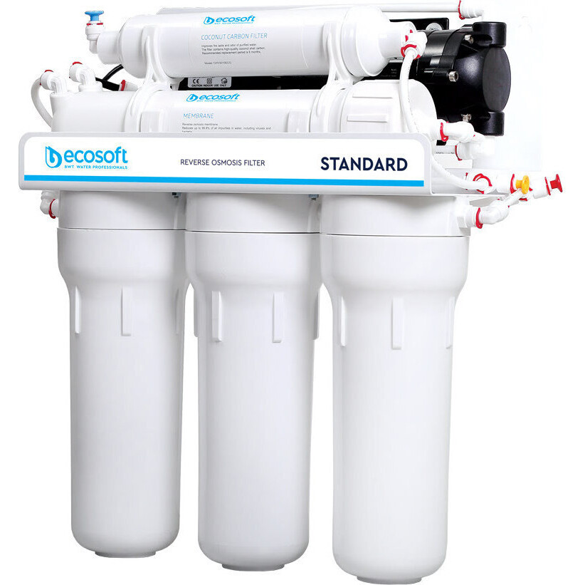 - Фильтр обратного осмоса Ecosoft Standard с помпой предназначен для очистки воды на молекулярном уровне в домах и квартирах со слабым напором в трубопроводе. Производительность фильтра - 8 л/час. Фильтр очищает воду от 99,8% загрязнений, таких как фтор, хлор, свинец, органические соединения, такие как хлорамины, перфтороктановая кислота (PFOA) и перфтороктансульфоновая кислота (PFOS), а также бактерии и вирусы. Очищенная вода полностью безопасна для организма человека. Она идеально подходит как для питья, так и для приготовления блюд и напитков.