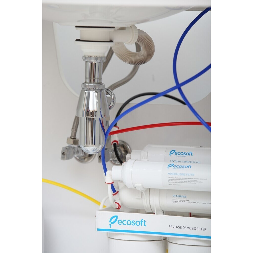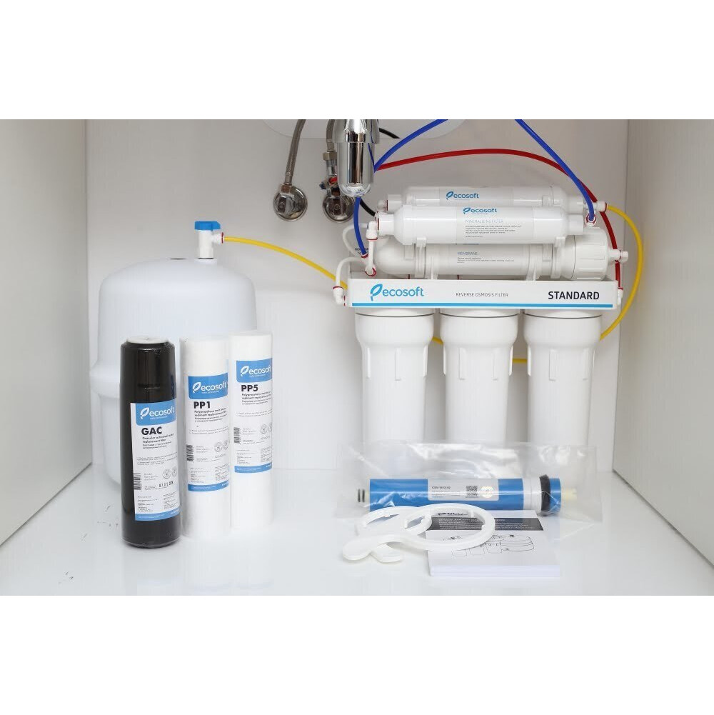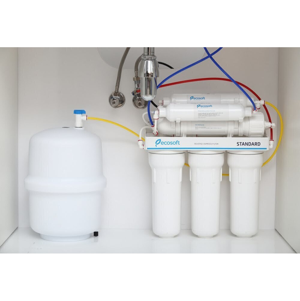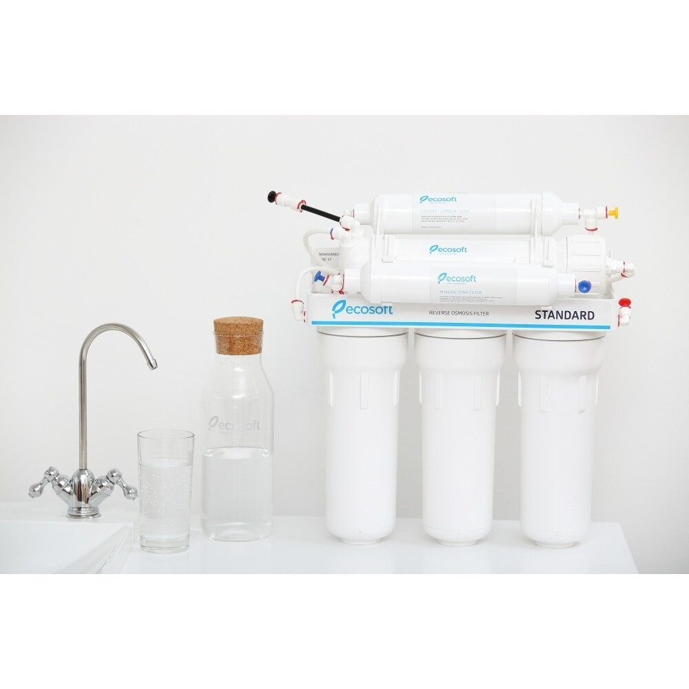 - Фильтр обратного осмоса Ecosoft Standard с минерализатором предназначен для очистки воды на молекулярном уровне и ее обогащения необходимыми минералами и макроэлементами. Производительность фильтра - 8 л/час. Фильтр очищает воду от 99,8% загрязнений, таких как фтор, хлор, свинец, органические соединения, такие как хлорамины, перфтороктановая кислота (PFOA) и перфтороктансульфоновая кислота (PFOS), а также бактерии и вирусы.