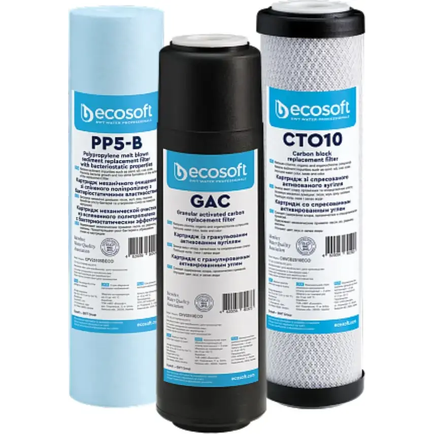 В комплект входят три картриджа Ecosoft, которые необходимы для предварительной очистки воды перед мембранным элементом в фильтре обратного осмоса. В улучшенный комплект входят два угольных картриджа, поэтому он подходит для очистки воды с высоким содержанием хлора.