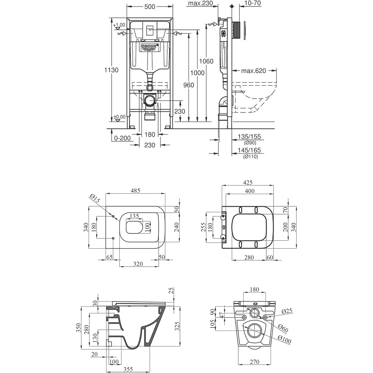 - Горизонтальный выпуск – совместимость с установкой Grohe Rapid SL.