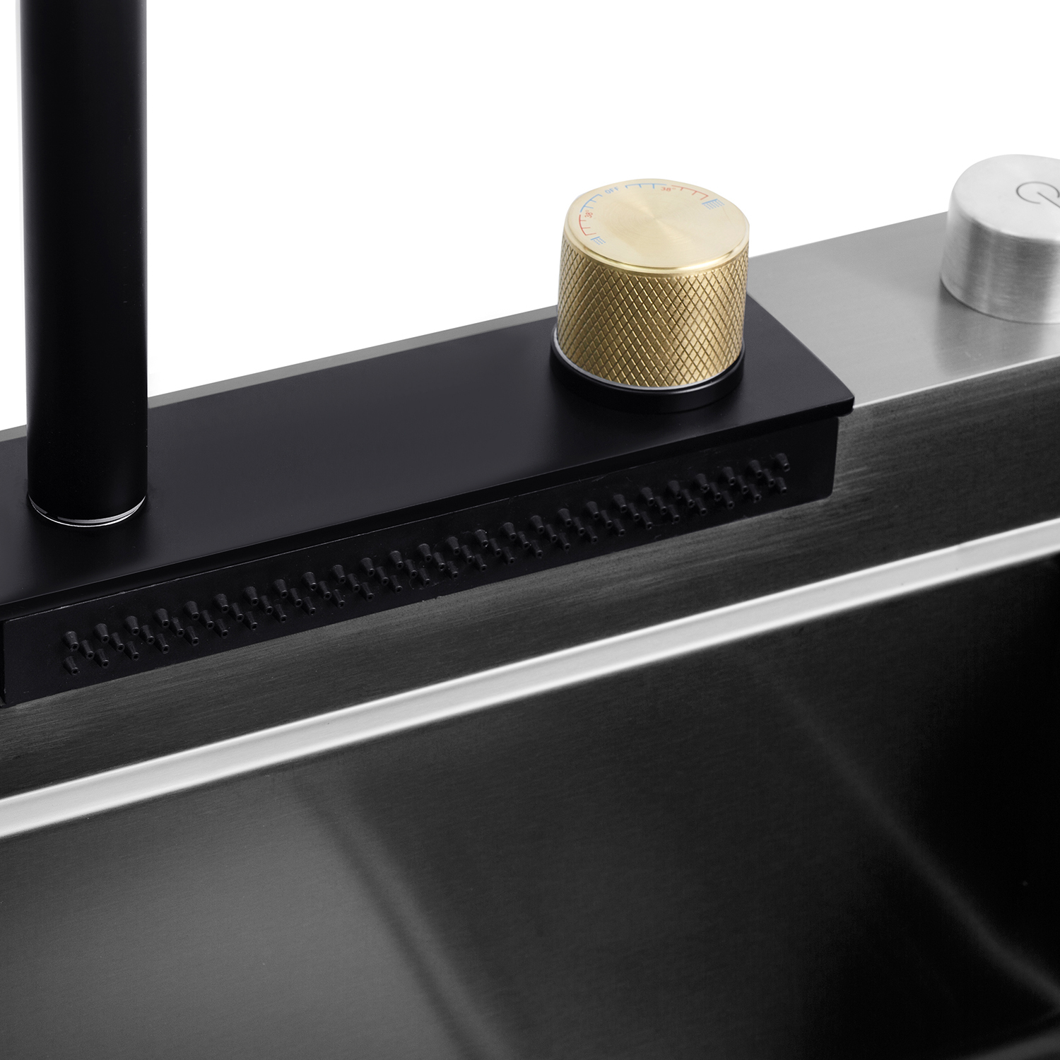 - Смеситель с выдвижным изливом: Имеет 3 режима и функцию водопада. Управление термостатическим картриджем делает использование более удобным. Левая сторона управляет смесителем, а правая - панелью с водопадом. Можно удобно мыть фрукты и овощи с помощью уникального водопада.