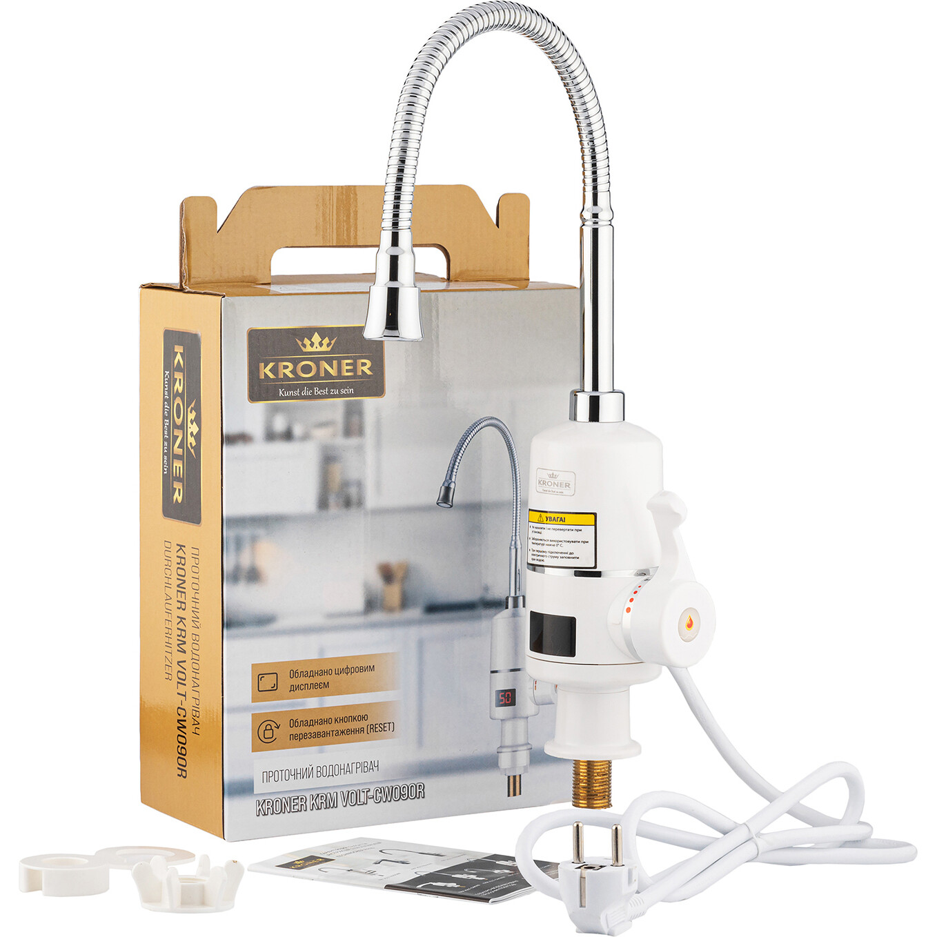 Проточный водонагреватель Kroner KRM Volt – CW090R с дисплеем – эффективное устройство для нагрева воды. Вариация цвета, хром и белый, придает современный вид интерьеру. Обеспечивается удобное подключение благодаря диаметру 1/2”. Благодаря номинальной мощности 3 кВт быстро нагревает воду, что обеспечивает комфортное использование в любое время дня. Дисплей позволяет легко настраивать температуру и контролировать процесс нагрева. Экономьте время и энергию с проточным водонагревателем Kroner KRM Volt - CW090R.