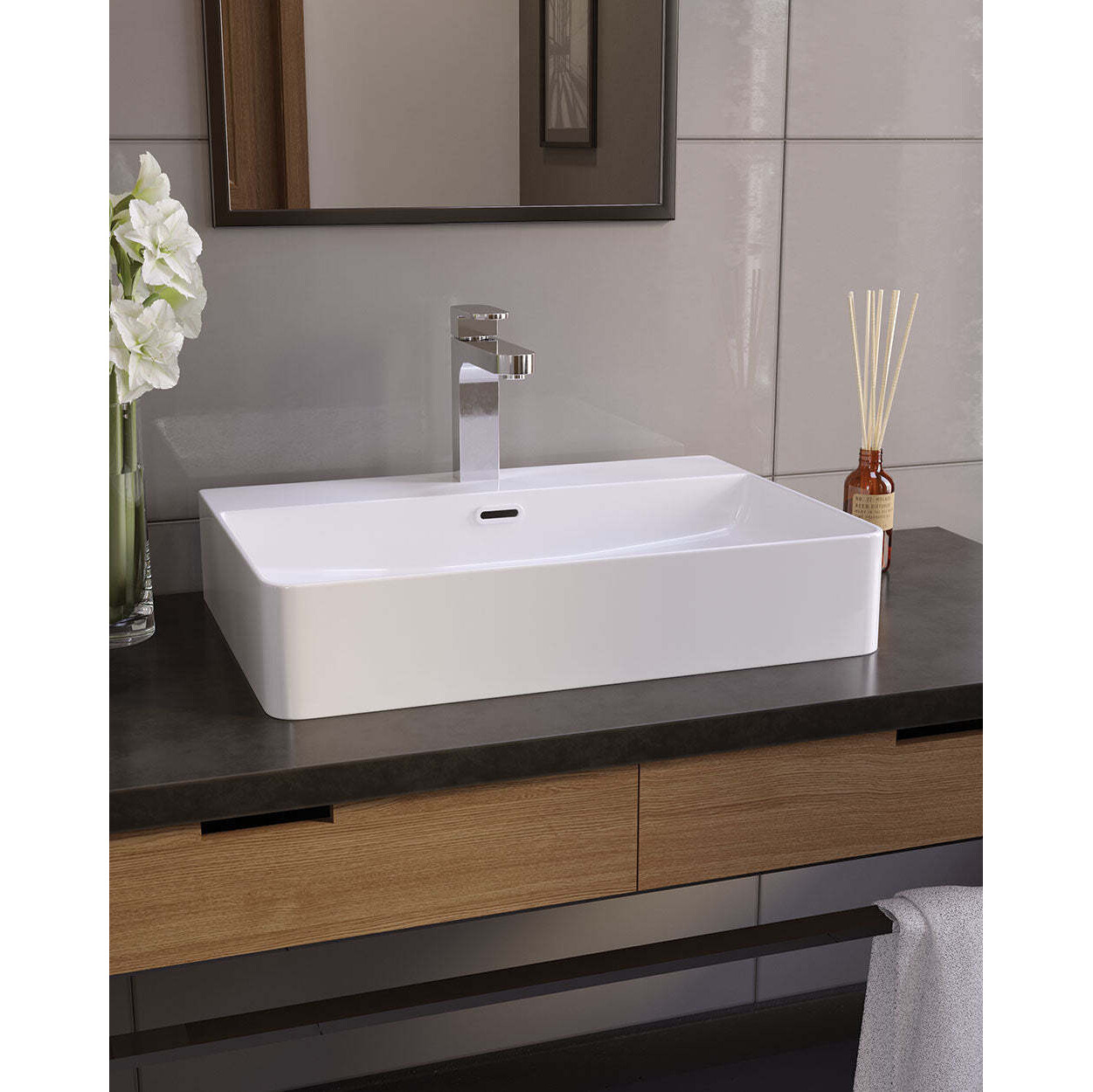 Умывальники на столешницу серии KVADRO - это элегантное решение для современной ванной комнаты, которое сочетает стильный квадратный дизайн и практичность. Изготовленный из высококачественной керамики, умывальник обеспечивает долговечность, устойчивость к износу и легкость в уходе. Доступный в разных размерах, он монтируется на столешницу, подчеркивая эстетику интерьера, и может быть выполнен как с отверстием для смесителя, так и без него, что добавляет гибкости в выборе дизайна и установки сантехники. Минималистичные формы умывальника создают современный вид и гармонично сочетаются с другими элементами интерьера, делая умывальник KVADRO идеальным выбором для стильного и функционального пространства.
