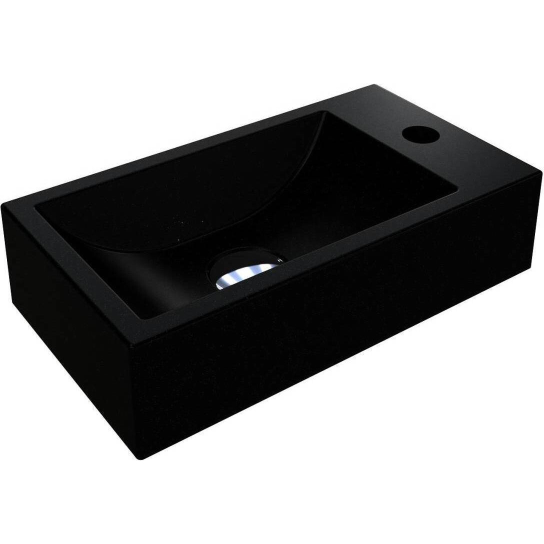 Черный прямоугольный умывальник из кварцевого песка FARO L – функциональный аксессуар для небольшой ванной комнаты в классическом, современном или минимализме стиле. Оптимальное решение для организации пространства благодаря возможности установить смеситель на крыле справа. Умывальник имеет подвесной тип монтажа.