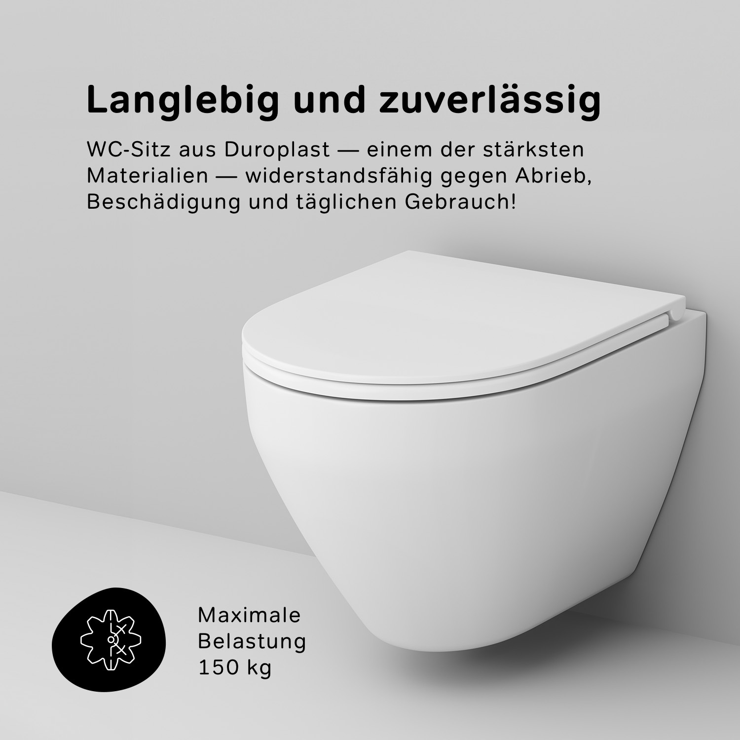 Материал сиденья дюропласт, устойчивый к появлению царапин, в сочетании с креплениями из нержавеющей стали гарантируют долговечность сиденья. Механизм плавного опускания, рассчитанный на 100 000 закрываний - комфорт в использовании, механизм быстрого снятия - легкость в уходе за сиденьем и керамикой.