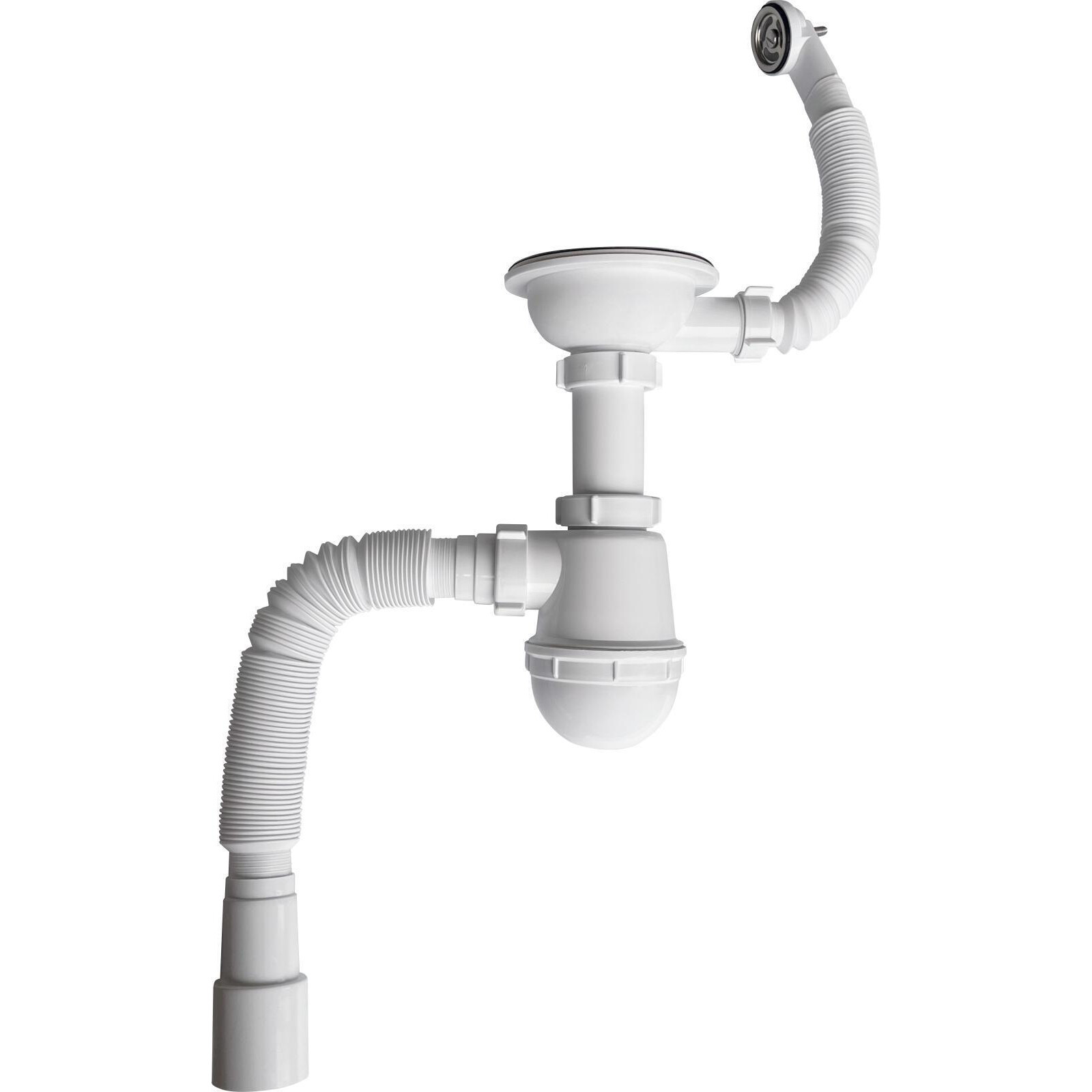 Сифон для кухонной мойки с переливом Lidz LK14 изготовлен из пластика белого цвета в виде стакана - колбы с металлической решеткой и гофрированных труб. Резервуар сифона откручивается для очистки. Гофрированный выход дает возможность изменять длину и угол трубы. Благодаря коммуникации для перелива можно избежать переполнения кухонной раковины водой.