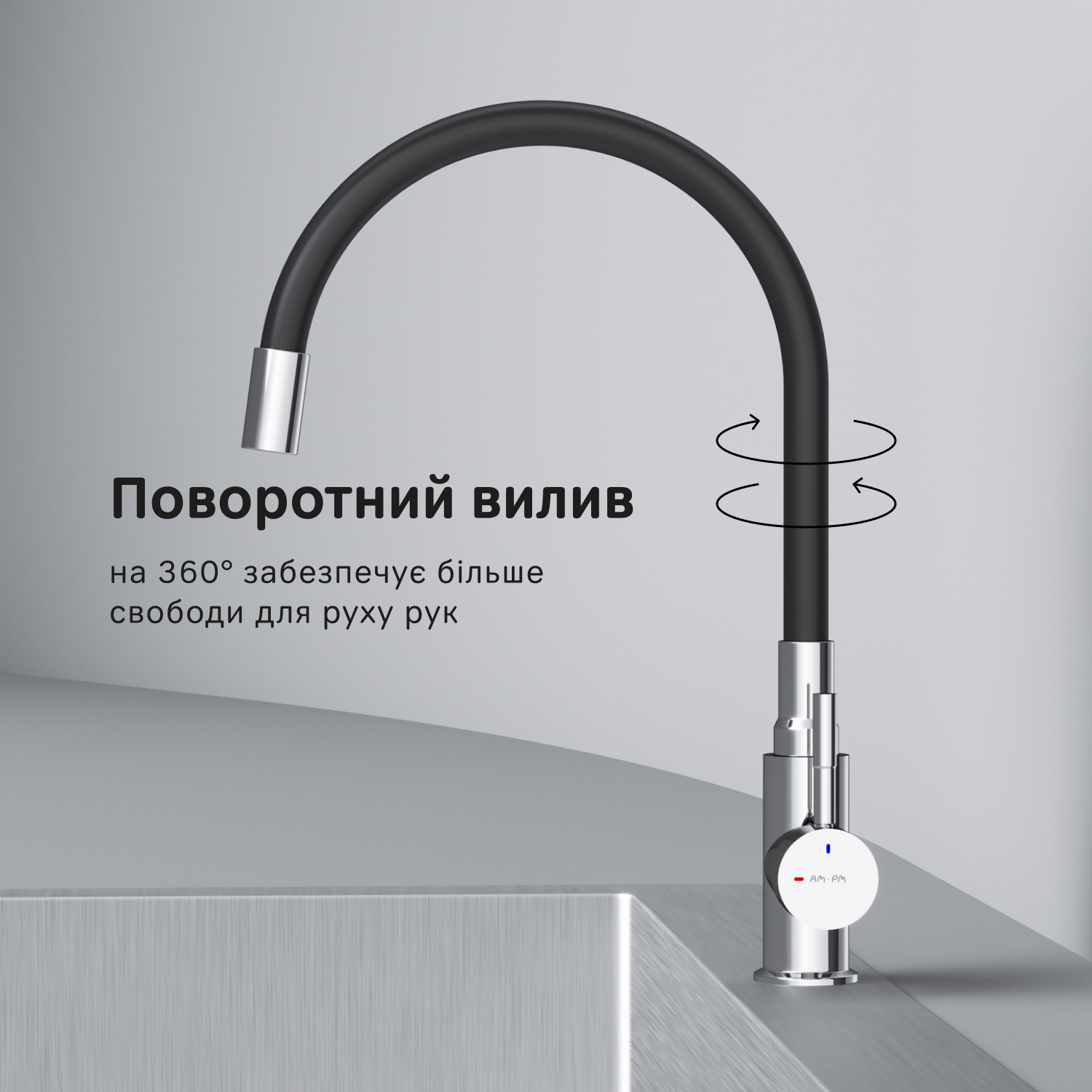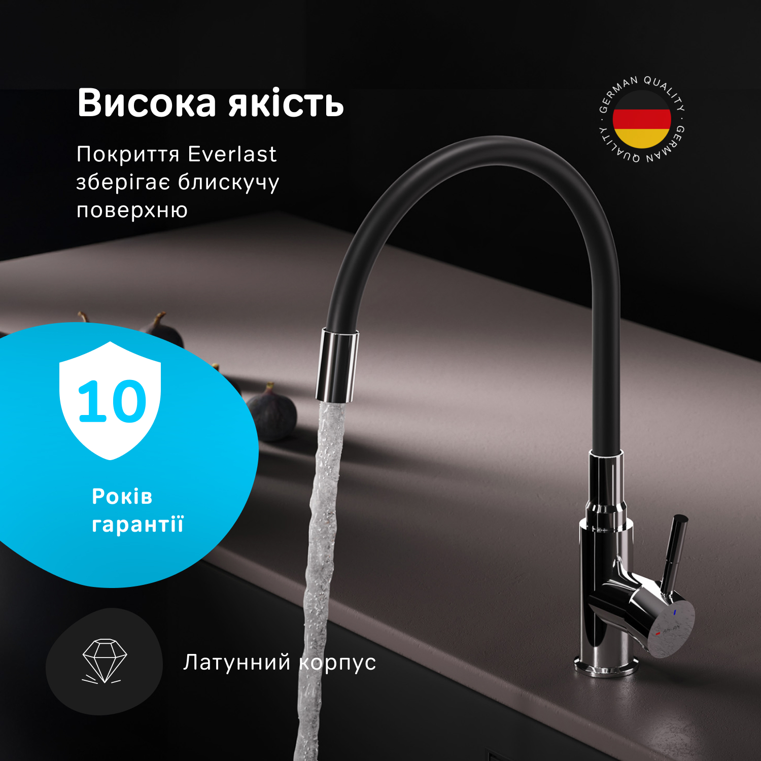 Гибкий излив обладает эффектом памяти – просто настройте геометрию излива под свои предпочтения, изменяя его высоту и угол наклона, как вам удобно. Кроме того, с помощью этого излива вы с лёгкостью сможете наполнять емкости любого размера и поддерживать чистоту на кухне.