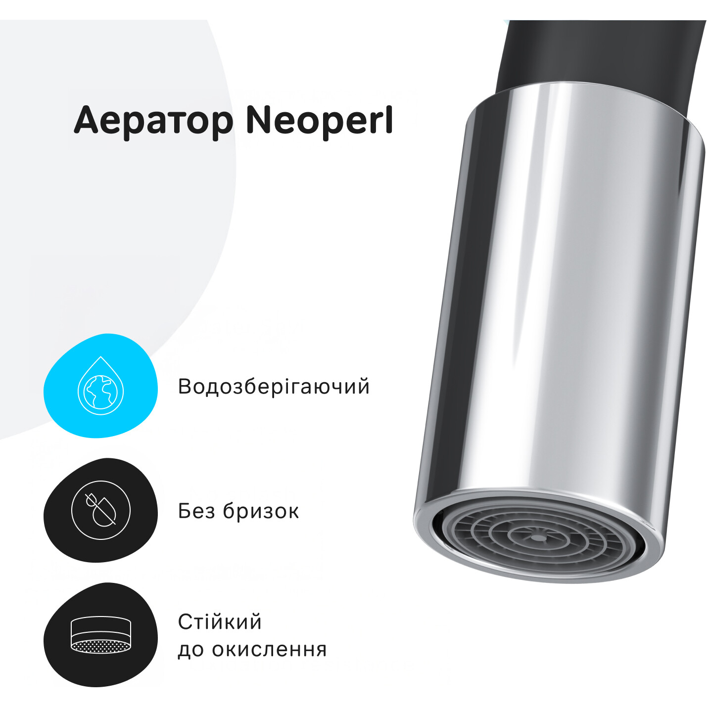 - Аэратор Neoperl использует водосберегающую технологию, смешивая водяной поток с воздухом, что предотвращает разбрызгивание воды