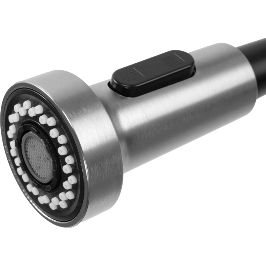 Металлический корпус которого, является гарантией долговечности и стабильности. Прочное покрытие делает его устойчивым к загрязнениям, а гибкий носик позволяет направить струю в любое место. На кончике носика есть переключатель, который позволяет выбирать между рассеянным и сфокусированным потоком.