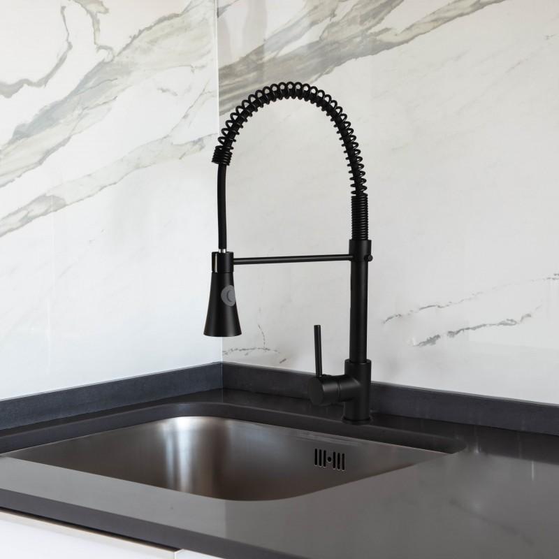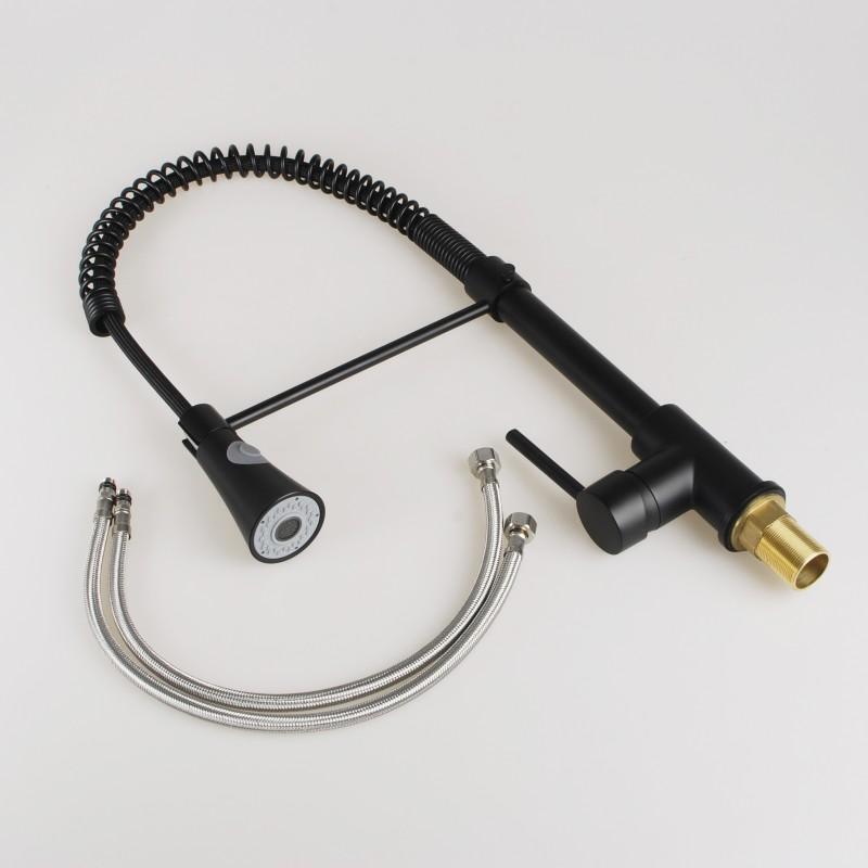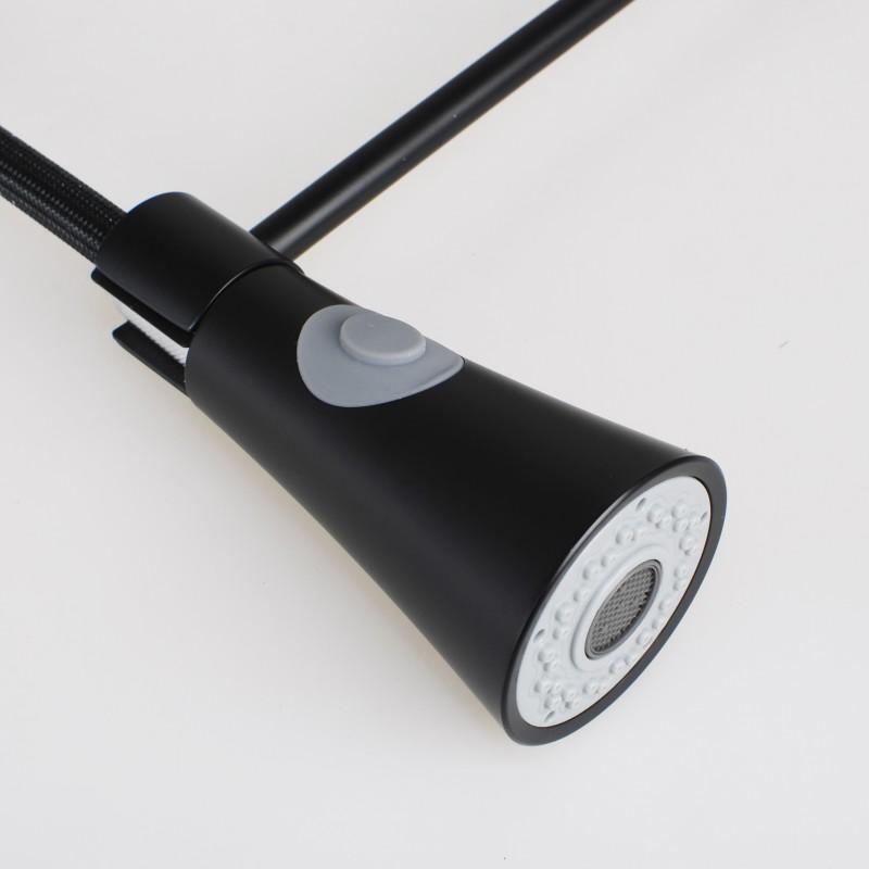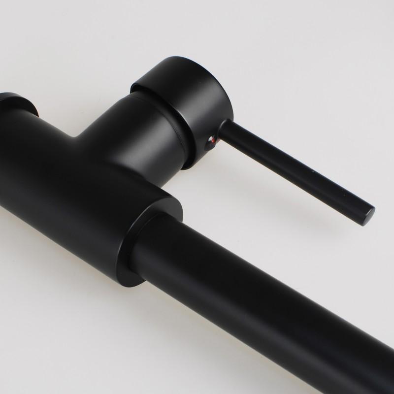 Смеситель для мойки механический однорычажный. Он изготовлен из высококачественной латуни. Керамическая головка обеспечивает долгий срок службы и долговечность батареи. Имеет длинный, подвижный, гибкий носик черного цвета и двухструйную насадку с режимом обычной струи и душа. Смеситель очень удобен и практичен в повседневном использовании — даже с большой двухкамерной мойкой. Смеситель также оснащен ручкой, которая стабилизирует носик. Наконечник для аэрации - аэратор - снижает расход воды до 40%. В комплект входят все необходимые для сборки элементы и два шланга в оплетке (50 см F 3/8"), обеспечивающие простой и быстрый монтаж для горячей и холодной воды. Смеситель отличается не только своей функциональностью, но и интересным внешним видом. дизайн.