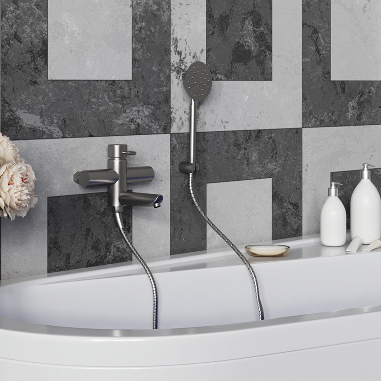 В комплект входят смеситель, лейка для ручного душа, душевой шланг, кронштейн для ручного душа, крепежные элементы и подробная инструкция, обеспечивая легкую установку.