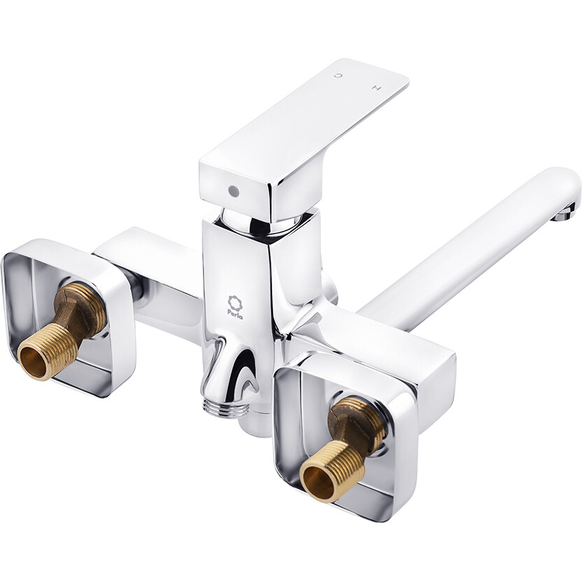 Изготовленный из хромированной латуни, смеситель обладает высокой устойчивостью к коррозии и механическим повреждениям, что гарантирует долговечность изделия. Его настенный монтаж позволяет сэкономить пространство и легко интегрировать в интерьер ванной комнаты, придавая ей современный вид.