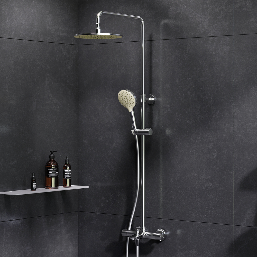 Продуманные детали для удобства использования: штанга регулируется по высоте в диапазоне от 840 до 1280 мм, обеспечивая комфорт для людей любого роста, шаровый шарнир в держателе верхнего душа позволяет регулировать угол его наклона, душевой шланг 1750 мм, верхний душ диаметром 250 мм, ручной душ диаметром 110 мм.
