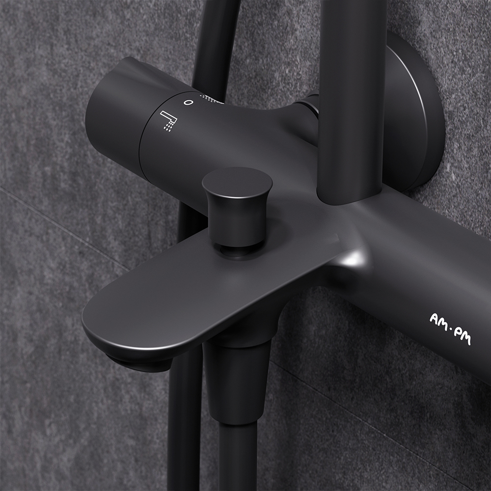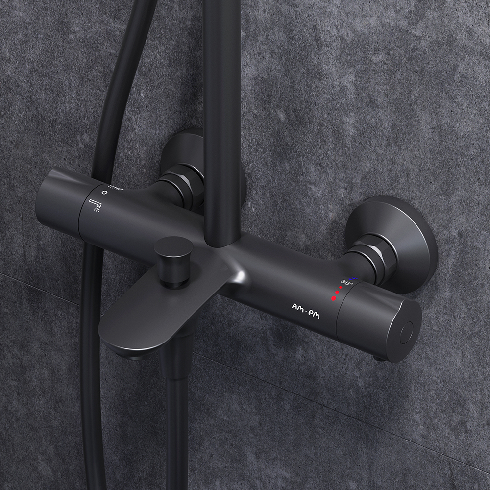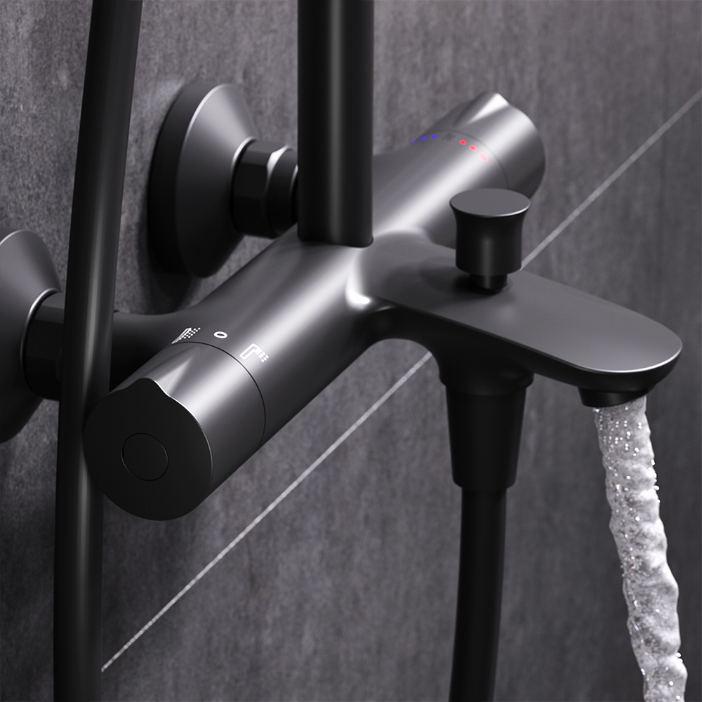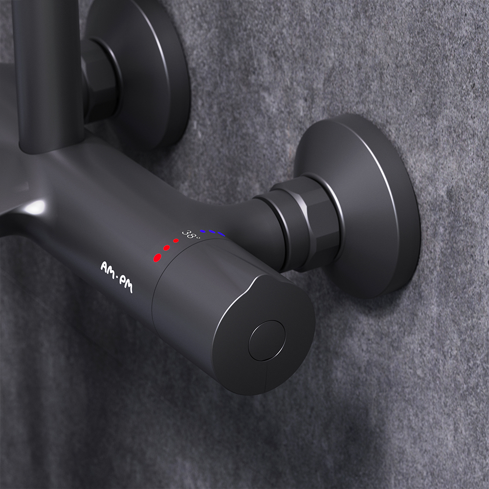 Смеситель для ванны и душа с термостатом: термостатический картридж с высокочувствительным термоэлементом, стопором безопасности на 38 градусов, быстрой реакцией на изменения температуры или давления надежно защищает от ожога даже при внезапном отключении холодной воды.